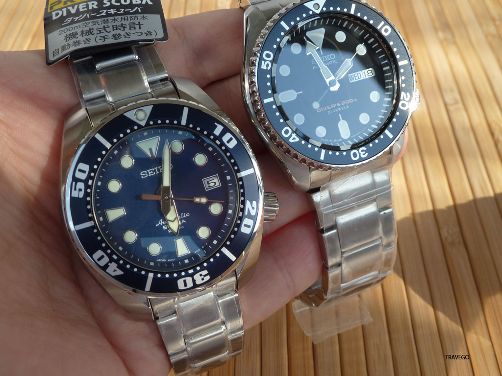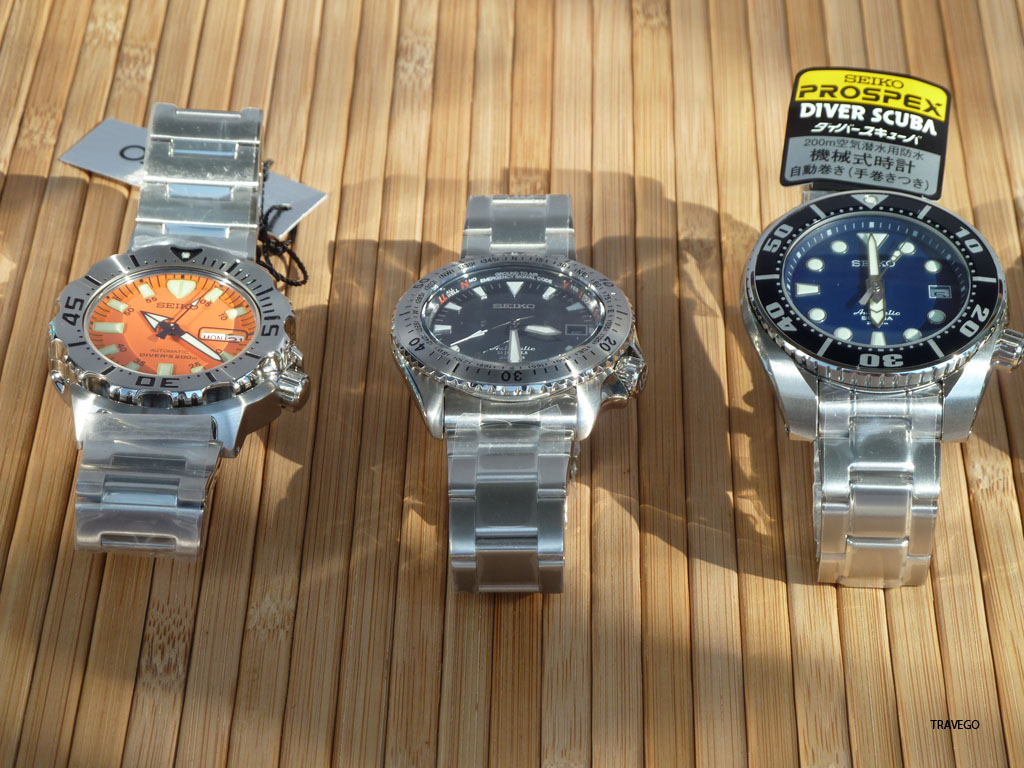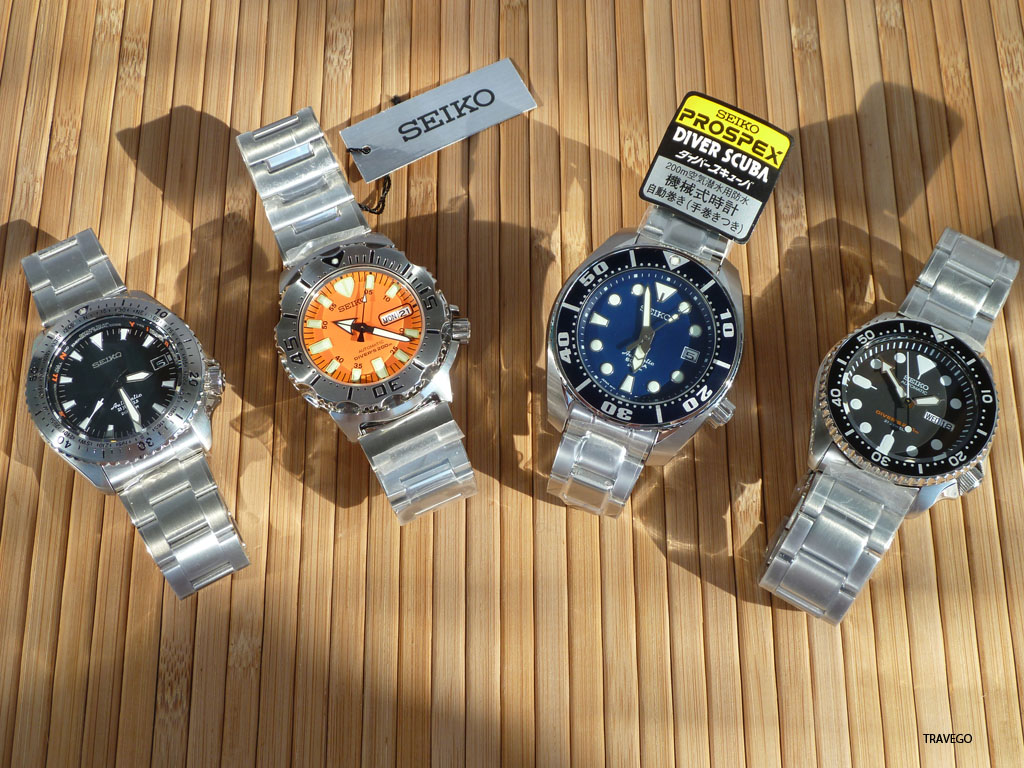 Итак представляю: Seiko SARB059 New Alpinist, Seiko SBDC003 Blue Sumo, Seiko SKX007J4, Seiko SKX781K Orange Monster. Строго говоря, Альпинист не из дайверской линейки, но имея качественный браслет с дайверской застежкой и 200 метров waterproof можно с полной уверенностью утверждать, что это дайвер