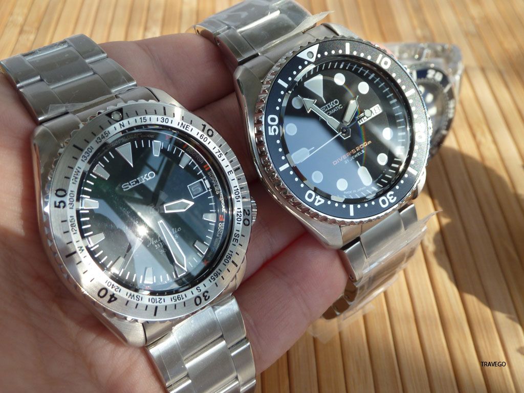 . Первым делом обнаружил, что корпус SKX007J4 и SARB059 довольно таки идентичен. Я говорю исключительно про сам корпус без крышки, безеля и начинки. Абсолютно одинаков размер, а так же отделка и полировка. Одинаковые заводные головки (только на Альпинисте с буквой “S” на торце). На Sumo несколько простоваты стрелки (по технологическим параметрам). А на Альпинисте все-таки самый замечательный циферблат с глубоким черным переходящим в такой же глубокий зеленый цвет с накладным логотипом “Seiko”. Остальное можно увидеть на фотографиях. Тут на вкус и цвет (а так же кошелек) как говорится…