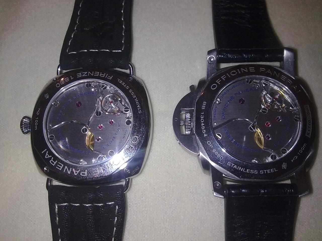 2. Моторы и функционал: и там и там 2002, но /1 в 233 и /3 в 268. Вид сзади одинаков, есть одно мелкое отличие в декоре, различимое в лупу. Нумерация 2002 калибра всех модификаций похоже сквозная - на 233 выпуска начала 2009 года - 94хх, на 268 начала 2010 - 113хх, не так уж и много выходит сделали за всю историю 2002 калибров. По функционалу 233 явно впереди: второе время, время суток, сброс секунды на "0", в 268 только прыгающий час, секунда вообще не останавливается. Кстати выяснилось, что это совсем не такой недостаток, как казалось заочно - все равно часы будут хоть чуть-чуть спешить или отставать, поэтому выставлять, дожидаясь совпадения секунд бессмысленно, а разницу и так можно засечь. Есть отличия и в ощущениях при заводе: 268 заводится быстрее из-за более удобной заводной головы, при этом нет упора при полном заводе, только чуть туже становится пружина по ощущениям, в 233 при полном заводе начинается характерное потрескивание, в 268 - ничего такого нет.Паз в котором движется указатель запаса кажется чуть шире в 268, во всяком случае относительно нарисованной под ним шкалы. 268 кажется чуть легче, взвесить, увы, не на чем. Точность хода: 233 на руке на 5-6 секунд в день спешат, лежа на 1-2 отстают, причем это не зависит от состояния пружины: что в первый, что в восьмой день одинаково, 268 один день, за который отстали на 2 секунды, лежа в коробке. 233 реально идут почти 10 дней, 268 уже сейчас ясно, что тоже более восьми.