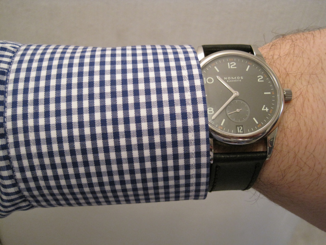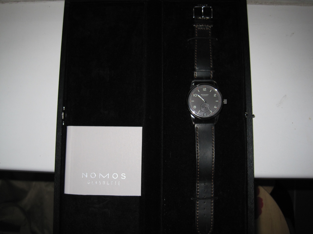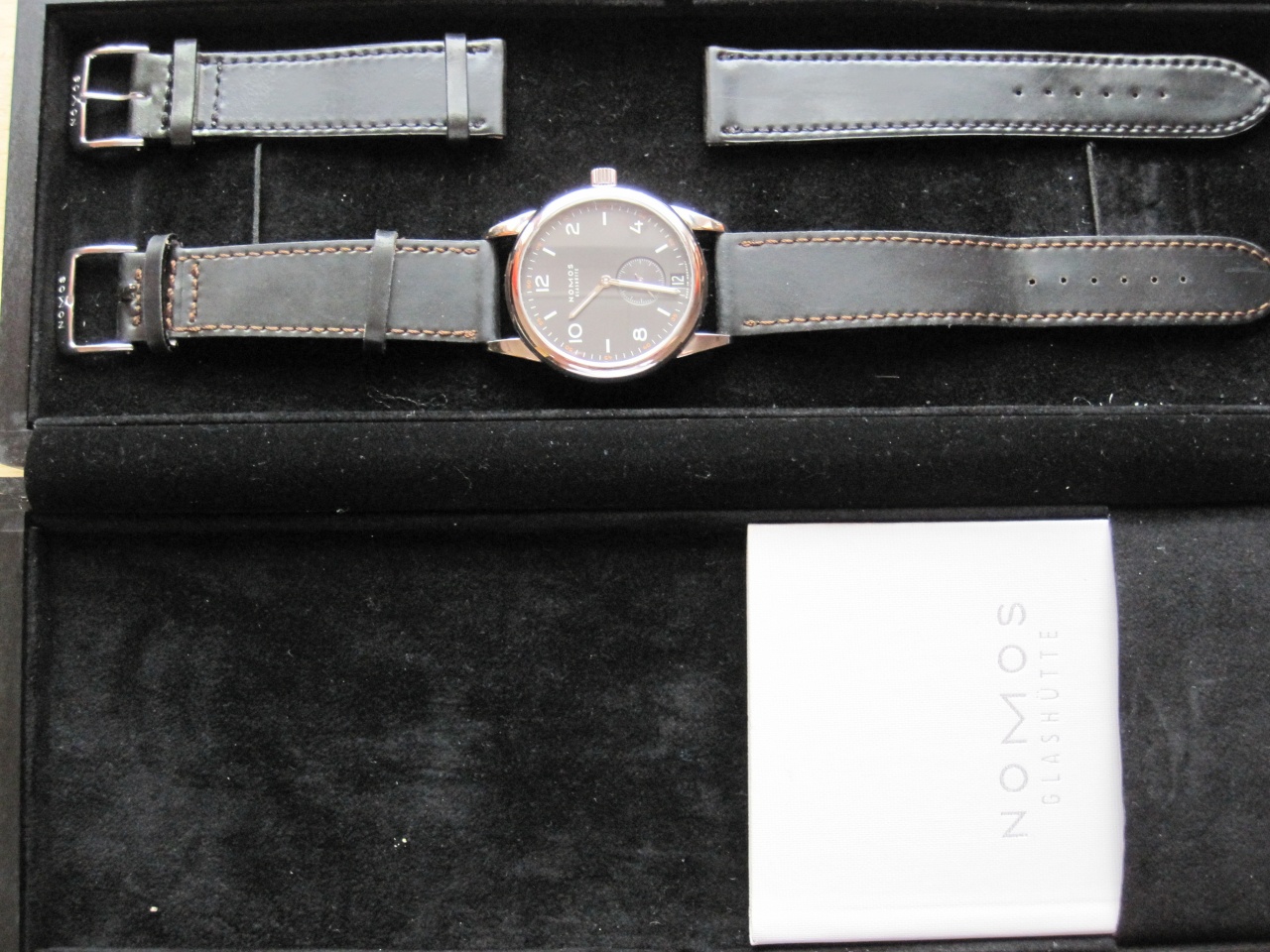 Теперь о самих часах. Они меня очень радуют, именно их я и хотел последние 3-4 месяца. Такой универсальный вариант и под классику и под кэжуал. Все необходимое имеется - дата, защита 100 метров, ручной завод. Ремешок отдельная история - очень мягкий, но в тоже время прочный. По моему мнению он наиболее всего подходит именно к данной модели, так как с совсем классическими Номосами он немного грубоват. Изначально часы комплектуются ремнем темно-темно коречневого цвета с коричневой же отстрочкой. Это наиболее универсальный ремень, так как цвет кожи почти черный и его можно носить в сочетании как с черными брюками-ремнем, так и с коричневыми. Но я в виде скидки попросил еще и абсолютно черный ремень. Надеюсь на фотках разница между ними будет видна. Кстати, заранее прошу прощения за фотки - мыльница она и есть мыльница.