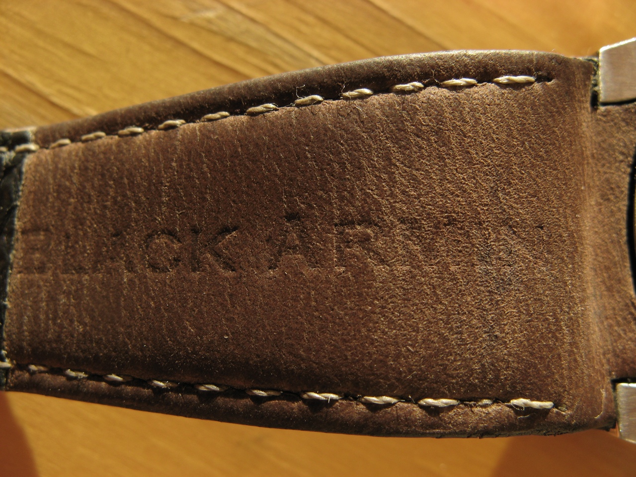 Ремешок кожаный, в два слоя. Наружный - черного цвета, исполнен под кожу змеи (а может и настоящая), внутренний - светло-коричневый с надписью genuine leather.
