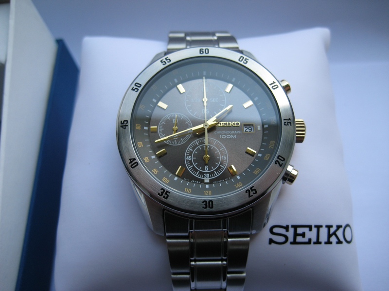 Металлический браслет, серый циферблат, золотистые стрелки, кнопки и головка.