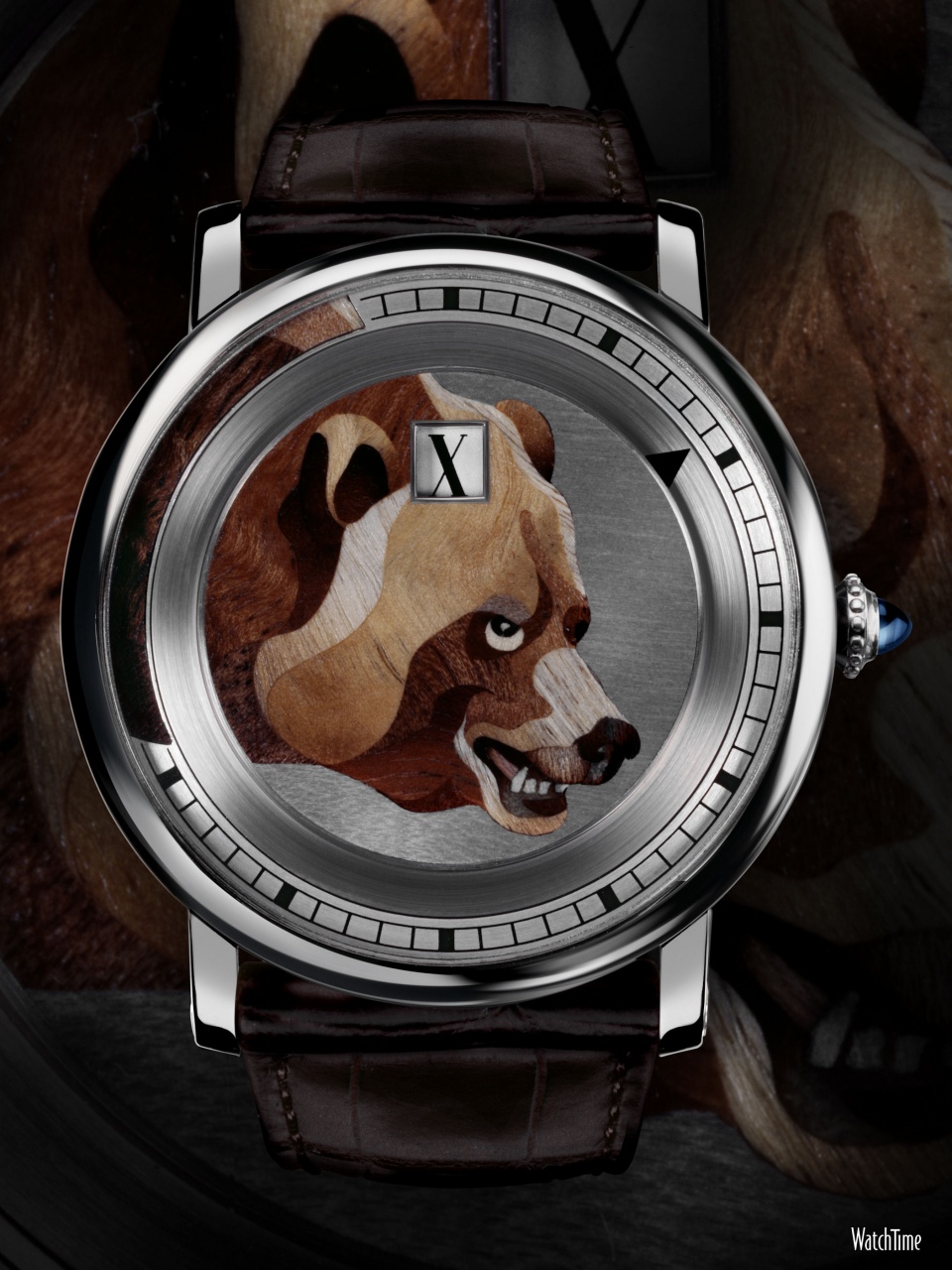 Компания Cartier выпустила новую версию модели Rotonde de Cartier с изображением медведя на циферблате. Причем это изображение выполнено методом маркетри (marquetry, инкрустация деревом по дереву), что требует художественного вкуса и твердой руки мастера, а также глубокое знание им качеств различных видов древесины. Для изготовления изображения медведя были использованы кусочки десяти видов природной европейской древесины, в том числе: каштана, тополя, ивы, серого и розового клена, ореха. Эта работа занимает около 160 часов скрупулезной работы. В результате, каждый экземпляр этих часов является уникальным.