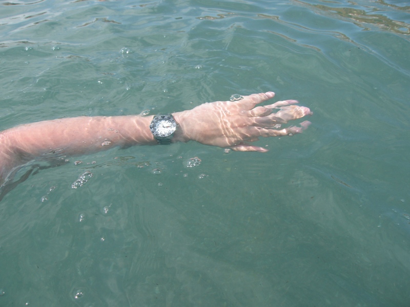 Когда впервые в часах спускаешься и плывешь в море, это очень необычно: свет через кристально чистую воду преломляется и отражается от часов. По- другому смотрится белый цифер, очень нарядный и совсем не обыденный, проявляется отделка браслета, сатинированного с частичной полировкой, словно хвост креветки, или чешуя крупной рыбы, переливающийся на солнце. Класс. Никогда не думал, что дайверские часы способны принести столько положительных эмоций. Странно, но они совсем не кажутся массивными, несмотря на огромный безель. Обладают очень мягкий удобным и надежным литым браслетом с двойным замком. А еще я нашел четыре треугольных уступа с внутренней стороны часов у крепления браслета. Наверное, это упоры противоскольжения при ношении на гидрокостюме, не знаю, но на руке не мешают.