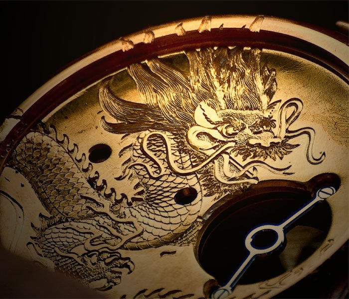 Круглый корпус из 18-каратного красного золота, диаметром 44 мм, водонепроницаемый до 30 метров. Имеет запатентованную систему Amadeo® Convertible позволяющую трансформировать часы в наручные, настольные, карманные. На лицевой стороне корпуса, циферблате и безеле выгравировано изображение дракона, на задней крышке - феникса. Оба изображения вдохновлены древнекитайской мифологией.
