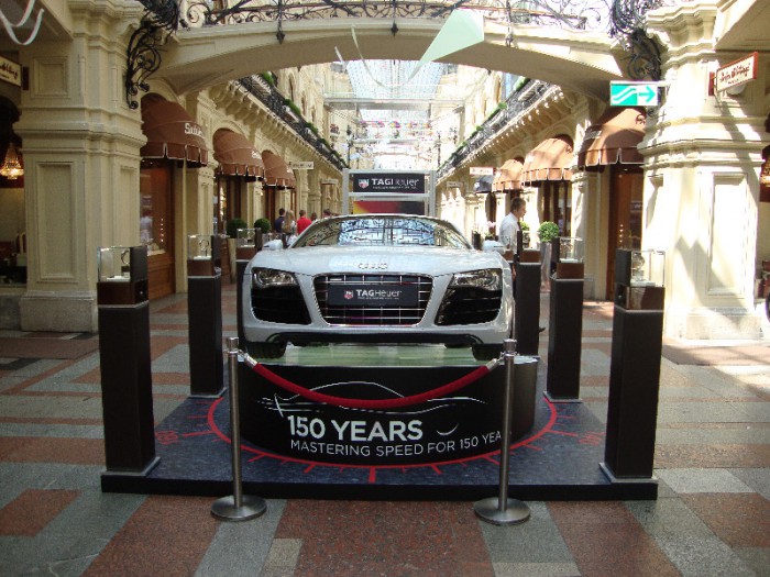 По случаю выставки в ГУМе выставлена эксклюзивная модель AUDI R8, чествующая 150-летний юбилей служения TAG Heuer идее покорения точности и высоких скоростей. В роскошном Audi R8 V10 сосредоточены все инженерные находки, накопленные за годы побед Audi на гонках в Ле-Мане. Атмосферный двигатель модели – компиляция технологий, используемых в гоночных автомобилях: таких как система смазки с сухим картером и технология непосредственного впрыска топлива FSI. Огромная мощь, потрясающая динамика разгона, ассоциирующаяся с освобождением колоссального запаса энергии, завораживающий звук двигателя… Все эти впечатления сливаются в чувство восторга от управления настоящим спортивным болидом.