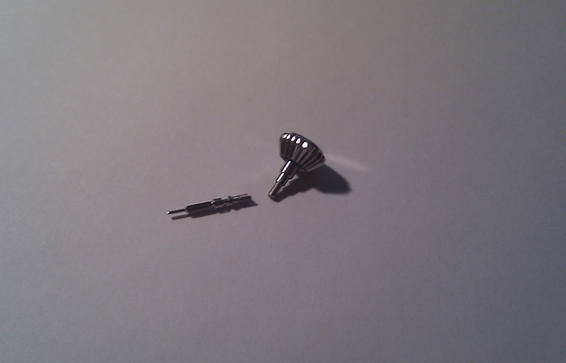 Получил по почте из Китая часы ММ от Гетат. Сразу обнаружилась проблема с заводом и переводом стрелок. Заводная головка вращалась с большим усилием и неравномерно. Осмотр часов показал, что причиной этого является слегка криво установленный в корпусе механизм. Я открыл крышку, снял головку с заводным валом, выправил на глаз механизм. Дальнейший осмотр показал, что заводной вал тоже слегка искривлён. При попытке выпрямить вал подручными средствами, он сломался.
