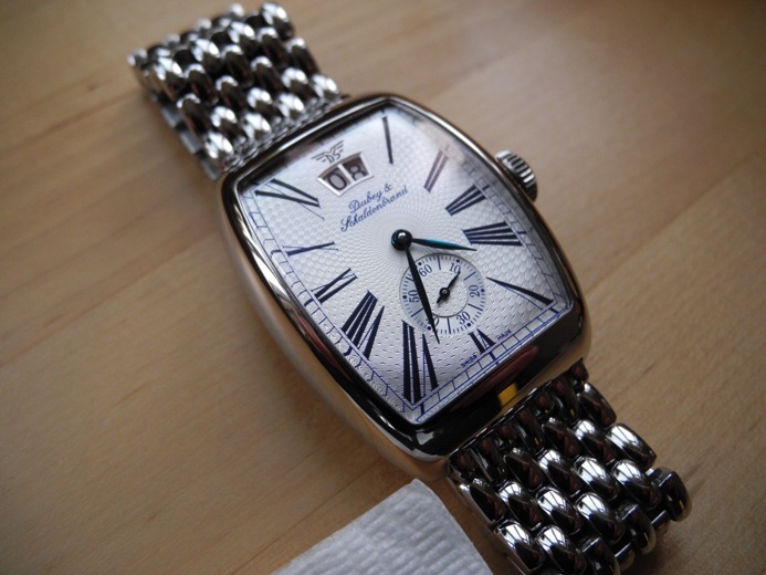 Циферблат: светлый, гильошированный; стрелки-"листок" из голубой стали; римские цифры и минутная шкала нанесены способом шелкотрафаретной печати.