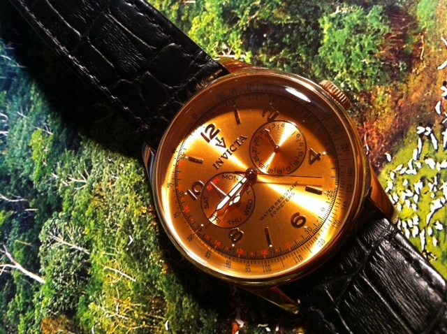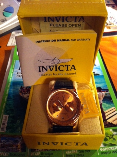 Отличные часы в цвете розового золота (обратите внимание, не желтое пошлое цыганское золото, а современное интеллигентное розовое). Имхо, очень интересные часы, действительно, такое модерновое ретро. Часы 44 мм, но довольно тонкие. Головка плоская, как на старых часах. Стекло на весь циферблат - это, как раз и привлекает взгляды. В остальном - повседневная универсальная Инвикта, подойдет как к строгой, так и к повседневной одежде. Джентльменский набор высококачественных часов от Инвикты присутствует: стекло Flame Fusion, стрелки и метки Tritnite, 50 метров водонепроницаемости, ремень из натуральной телячьей кожи, покрытие IPG суперстойкое. Механизм кварцевый швейцарский. Дилерская цена 795 баксов - это около 23 000 рублей. Моя всего лишь от 4990 рублей!