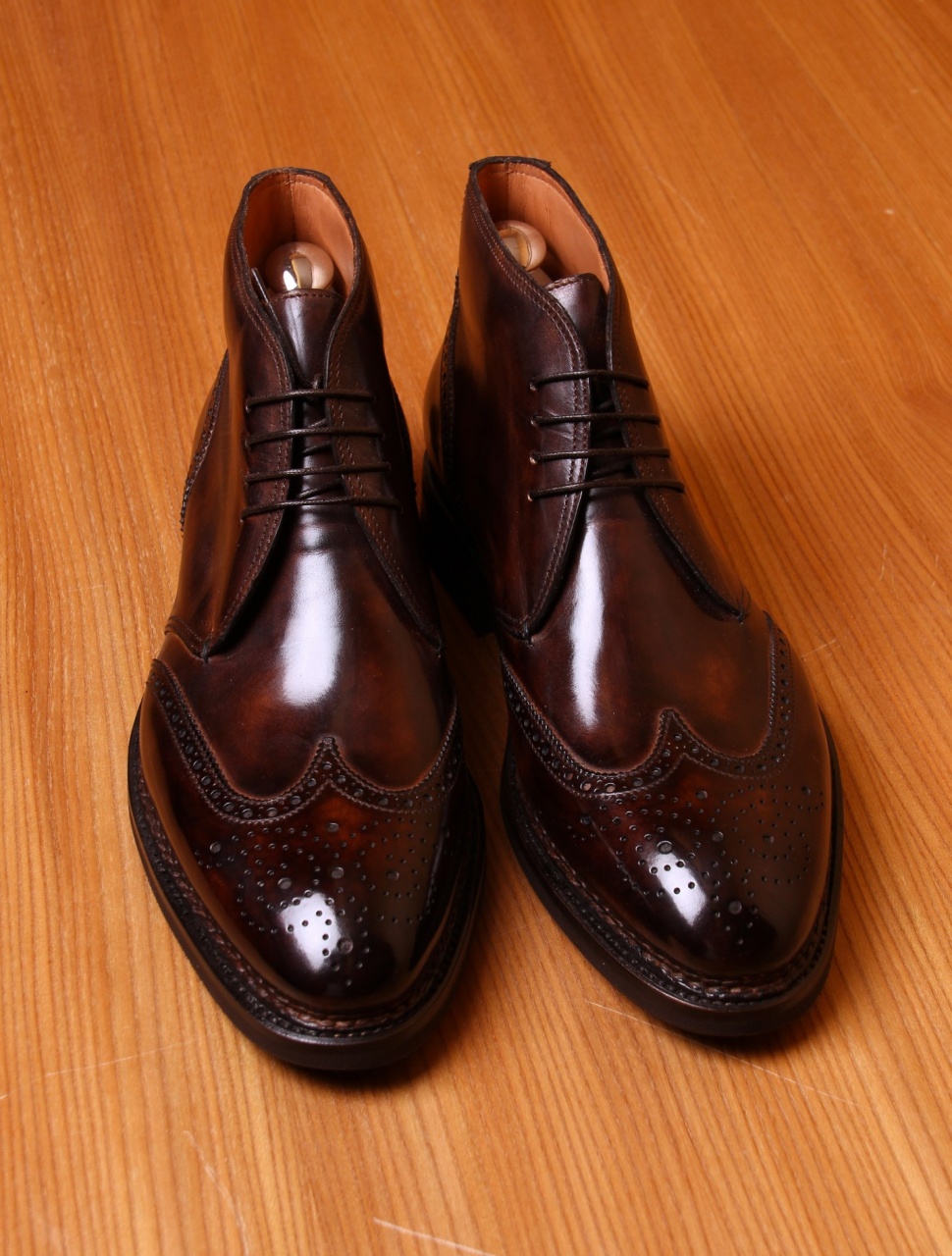 Боты очень ладные! Ни у Лобба, ни у Грина таких не найти по качеству исполнения (bespoke не берем). Швы, даже по фото видно, выполнены вручную и прекрасно вписываются. Кожа дубовая телячья, очень похожа на ту, которую использует B&V - заломы на ней маловероятны. Есть ощущение "фанерности", но оно проходит когда обувь разнашивается. По картинке трудно её оценить, но когда берешь в руки - ощущение слитка свинца. Вот есть, к примеру, чукки Alden cordovan. Обувь тяжелая по весу, тяжелее тех же B&V, Spernanzoni, но нет от неё такого ощущения, хотя и сделаны неплохо.