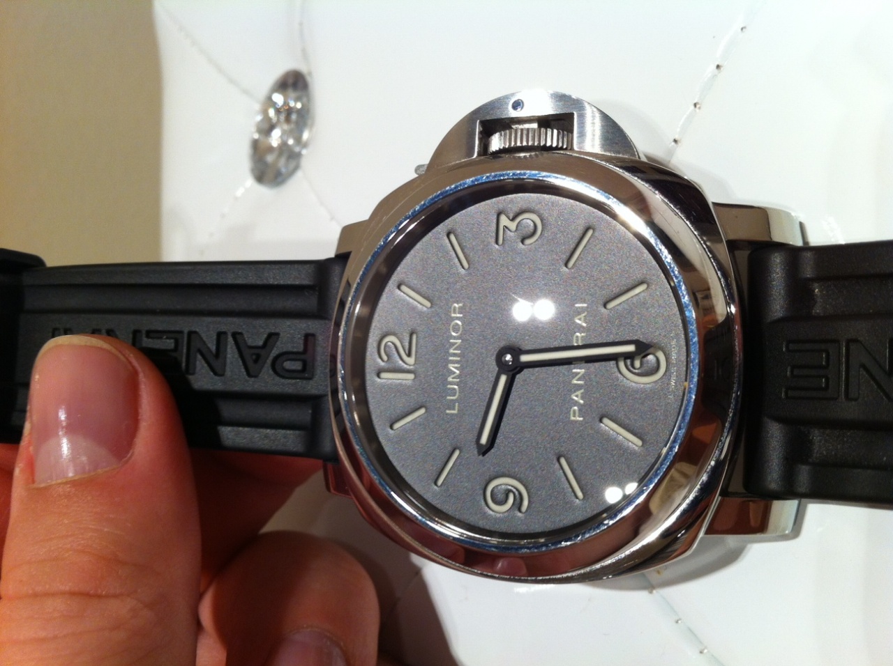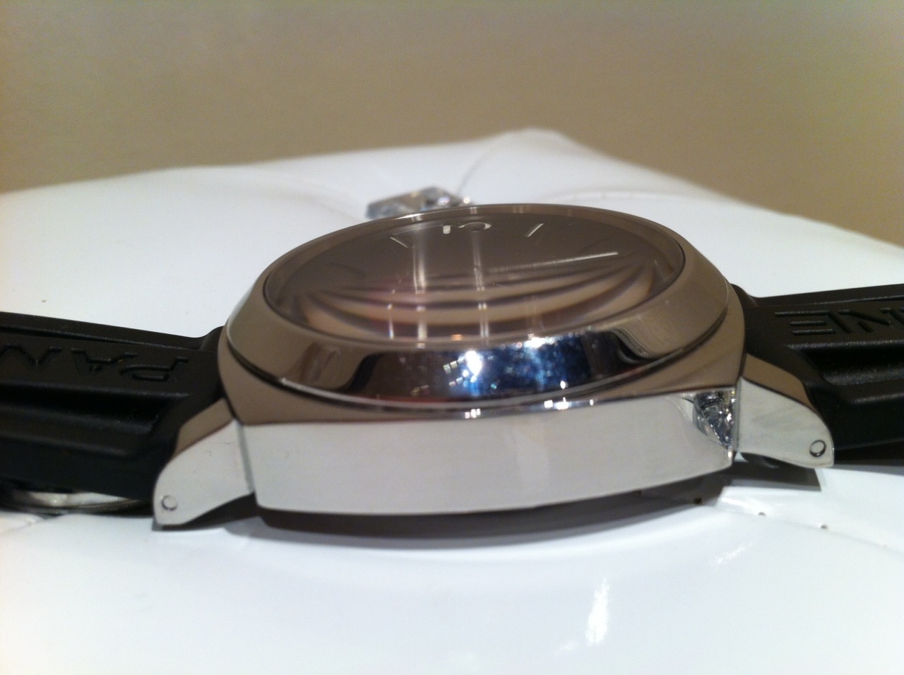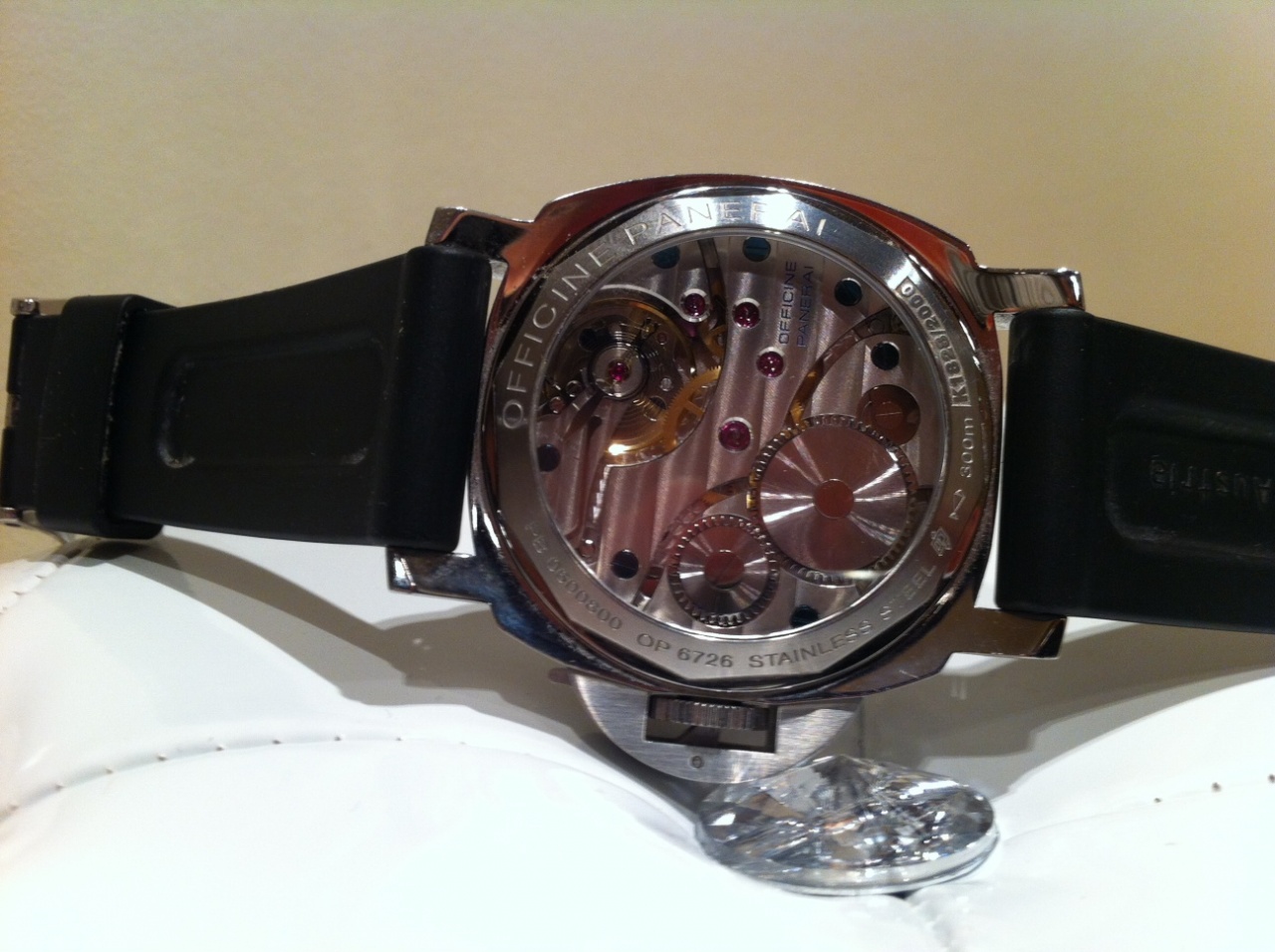 Movement: hand-wound mechanical, Panerai OP X calibre with swan's neck regulator, 16½ lignes, 17 jewels. Cotes de Genève decoration on the bridges. Glucydur® balance with Nivarox® I spring, 21,600 alternations/hour.