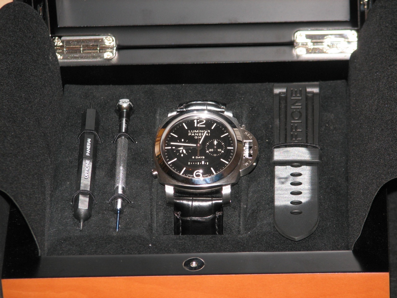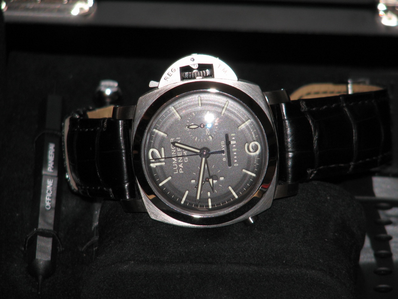 Механизм этой модели из серии Luminor полностью принадлежит Panerai. Простой циферблат с окошечком даты и горизонтальным индикатором запаса хода снабжен двумя хронографическими циферблатами, а также еще одной стрелкой, позволяющей контролировать второе время. Индикатор день-ноч. Частота 28 800 полуколебаний в час, 29 камней. Корпус нержавеющей стали, 44 мм. Циферблат черный. Запас хода около 8 дней. Водонепроницаемость 100 м. Стекло - сапфир с антибликовым покрытием.