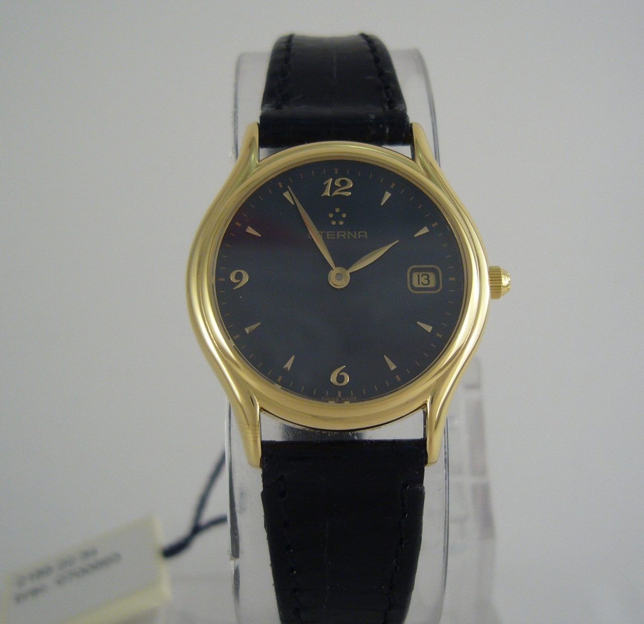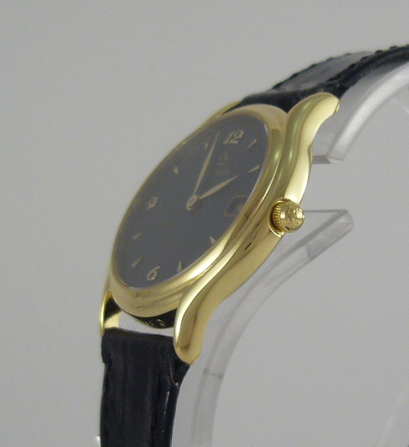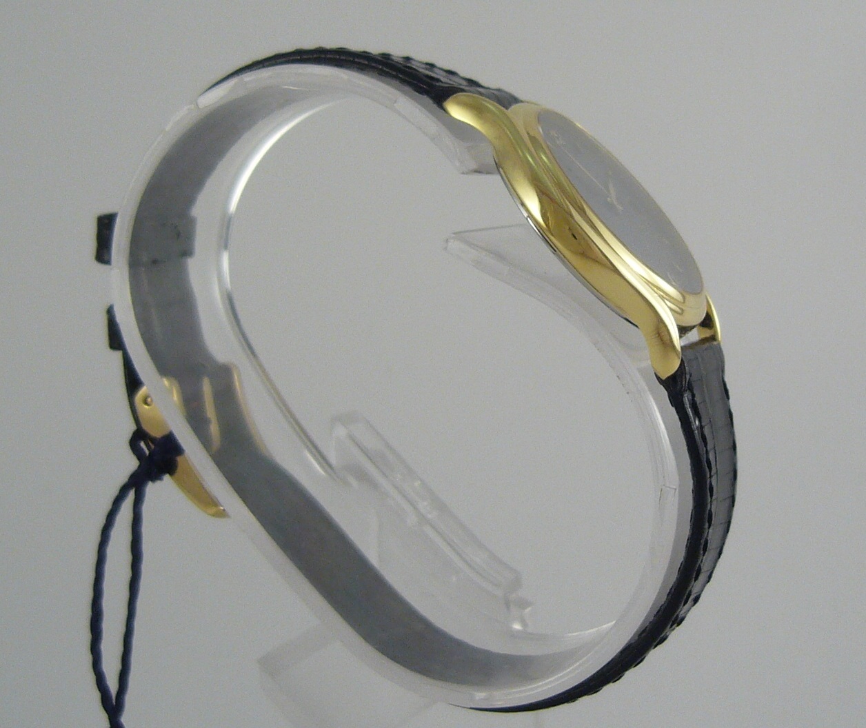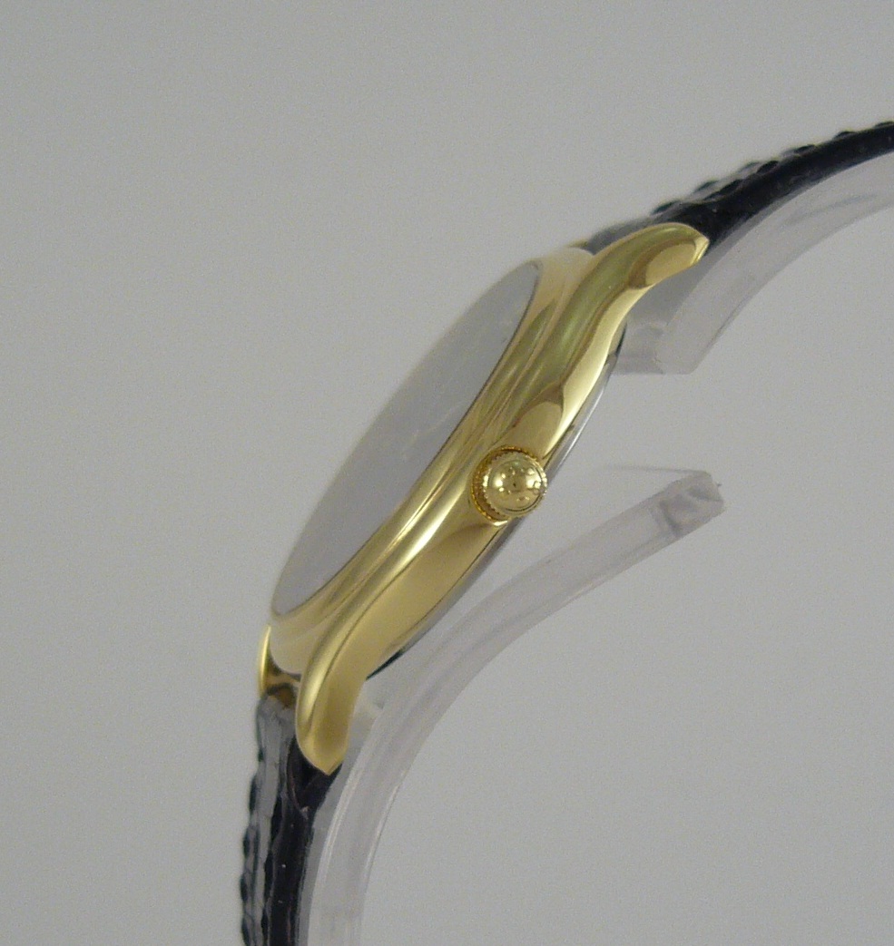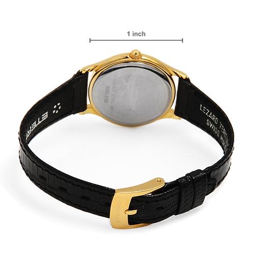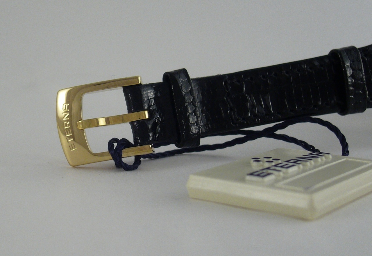 Ремешек - черная кожа ящерицы с позолоченной пряжкой.