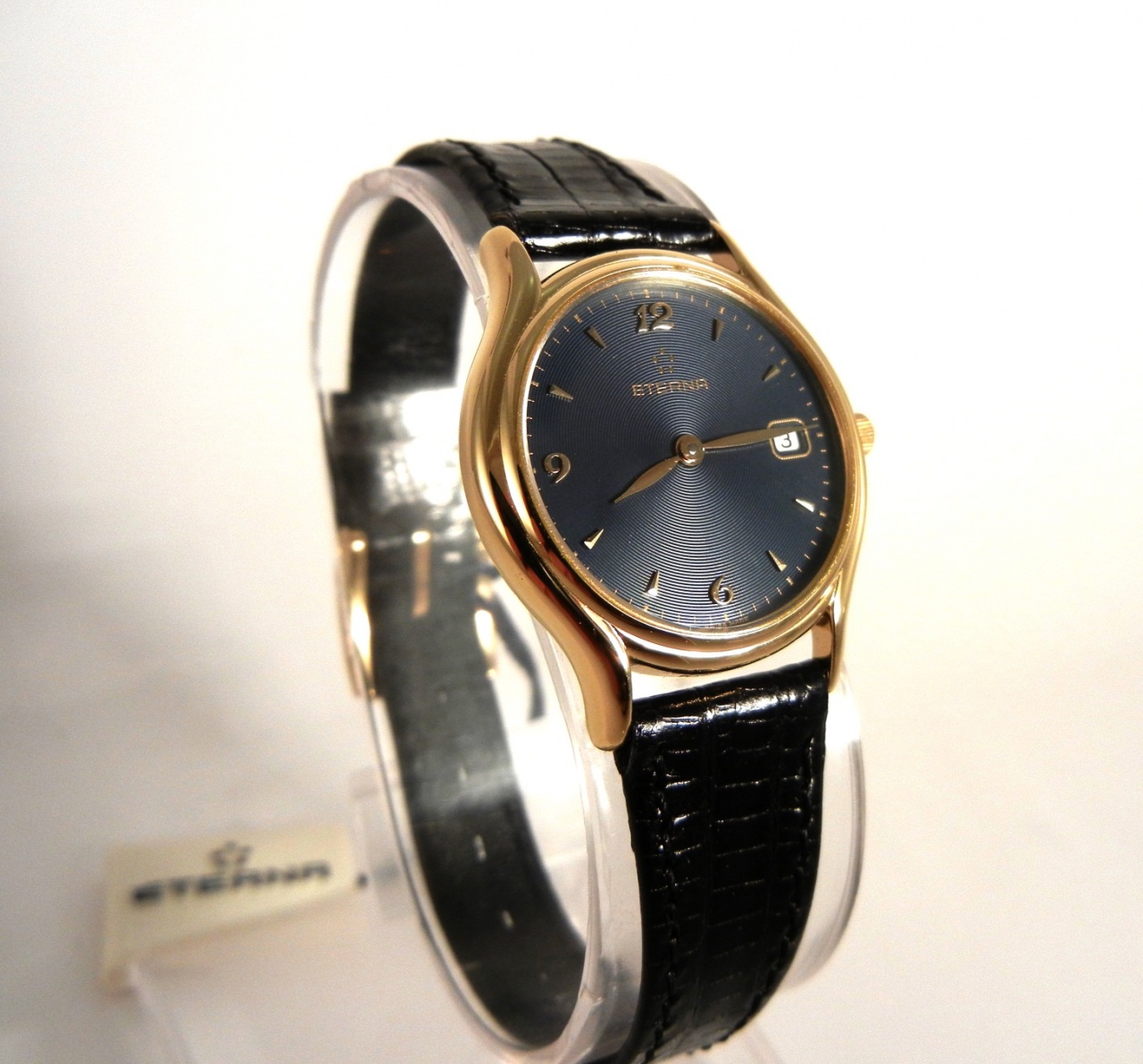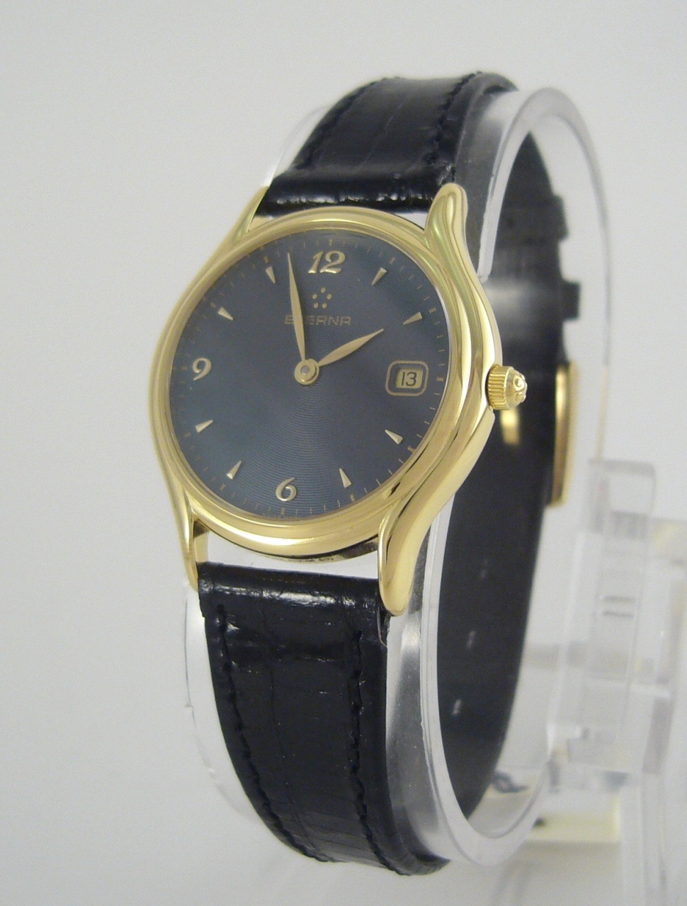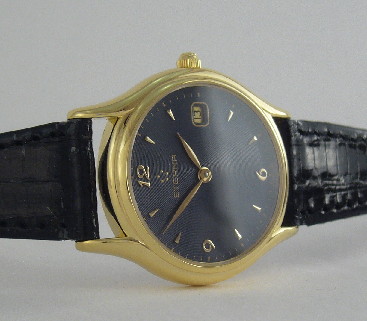 Циферблат - темно-синий с позолоченными часовыми отметками и арабскими цифрами на 3, 6, 9 и 12 часов.
