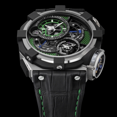 [см. об этой модели подробнее на нашем форуме здесь. Ego]. И вот в завершение 2011 года Concord представляет новую волну провакационных часов C1 Tourbillon Gravity. Это коллекционное издание в титановом корпусе со скелетонизированным циферблатом, который накрыт перфорированной сеткой, сделанной из анодированного алюминия. Элементы циферблата и стежки на кожаном часовом ремешке представлены в 4 цветовых решениях: желтый, зеленый, голубой и розовый.