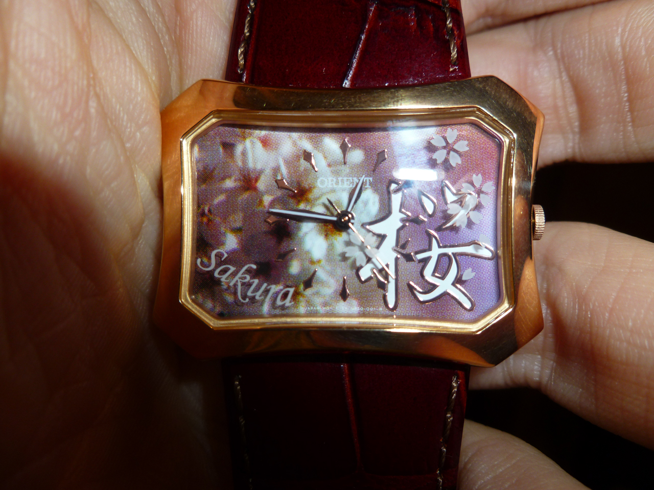 Расстройству жены не было предела, еще бы настроилась на подарок – а тут такая неприятность. Я решил, во что бы то ни стало исправить это недоразумение. Сначала жена не хотела идти по часовым магазинам, но потом вошла в азарт. И вот перед нами снова Ориент. И новые модельки, которые на сайте были не представлены. Я конечно большой поклонник Японии, не только часов, но и автомобилей, анимации, культуры и т.п., но я никак не мог представить, что жене больше всего понравятся часы с рисунком сакуры (один из символов Японии) и здоровущим иероглифом (видимо за годы совместной жизни я повлиял на её творческую натуру
