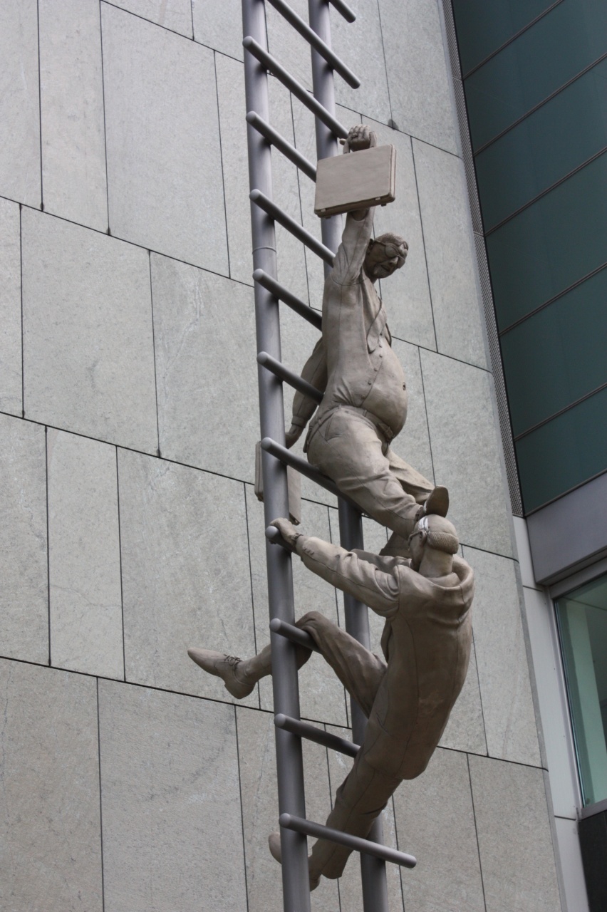 Толпа изможденных подростков в последний раз тоскливо взирает на окружающие их равнодушные небоскребы и бросается в бурные воды омывающих рек. Ибо все тлен и суета. Чрезвычайно философичная статуя.