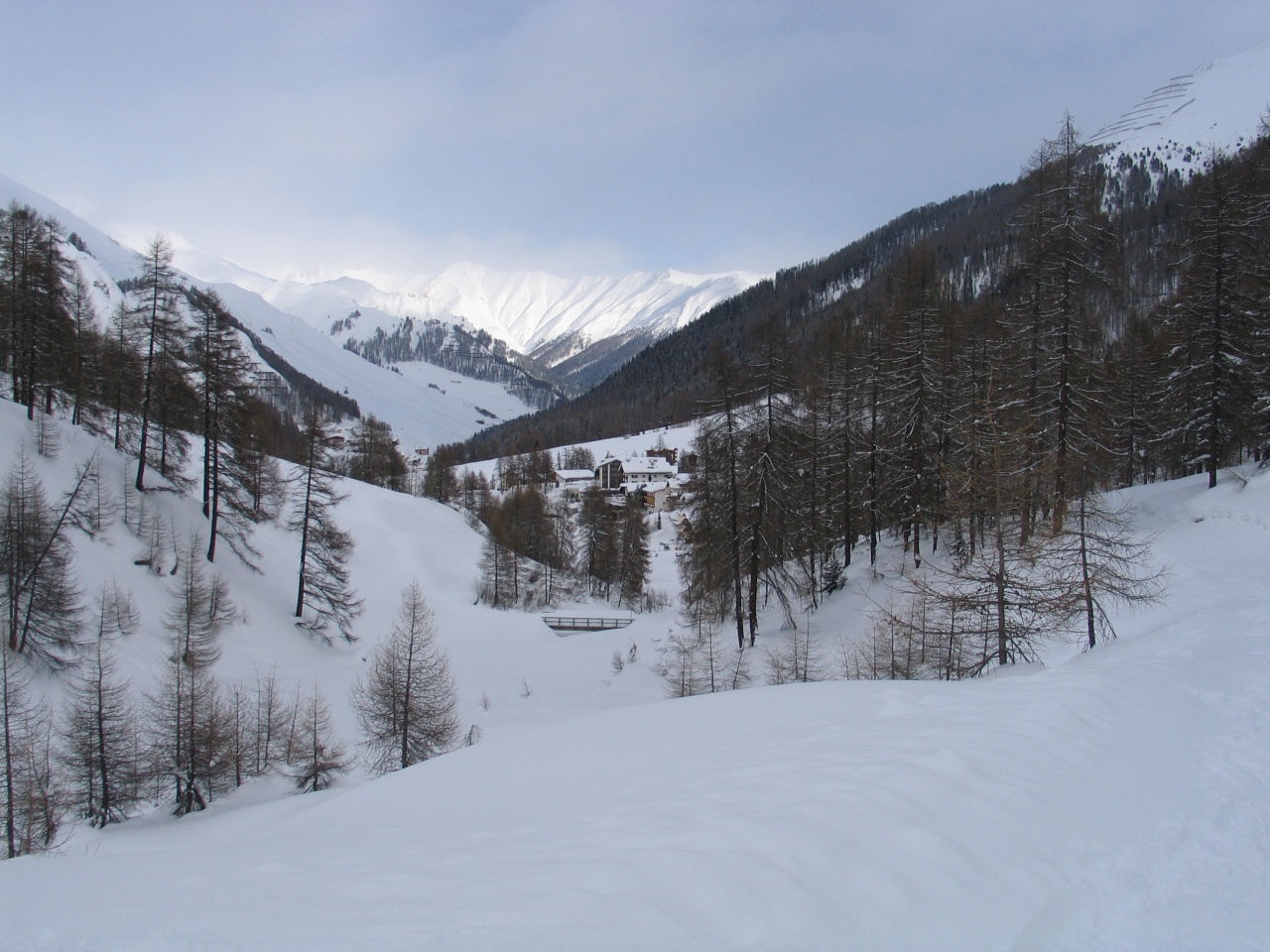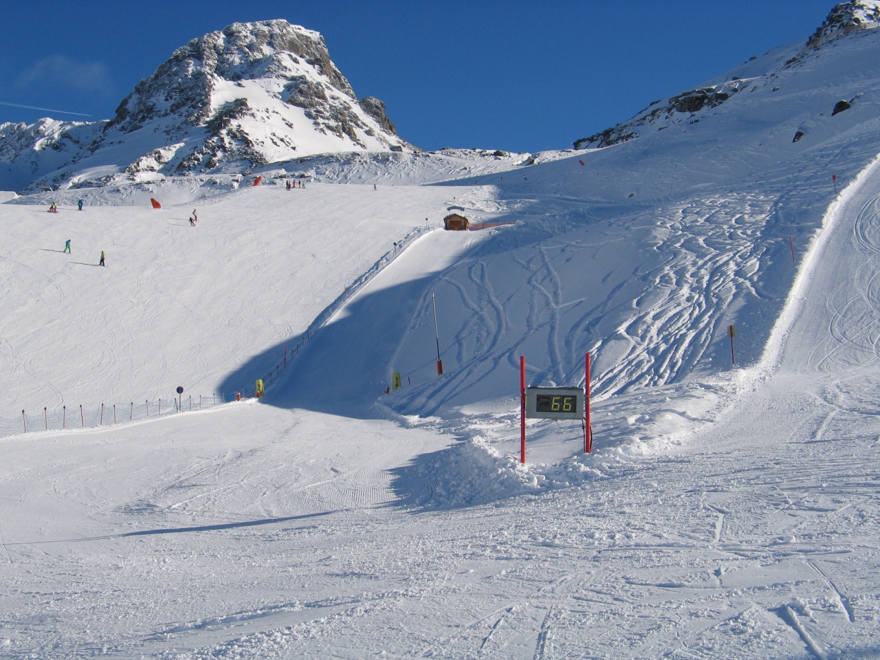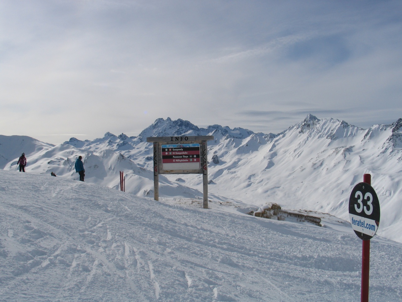 Город Ишгль находится на самой границе со Швейцарией, поэтому зона катания - общая с маленькой швейцарской деревушкой - Замнаун. На фото можно заметить - перевал с флажками двух стран - граница. Слева, меньшая зона катания - Замнаун и деревушка на самом верху, справа - Ишгль.