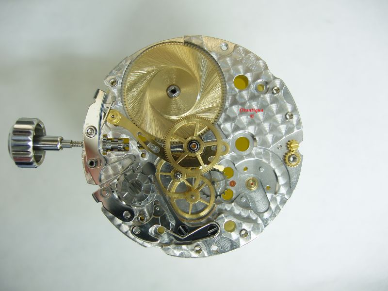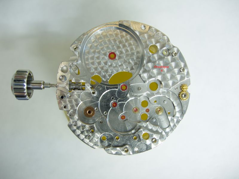 Внизу, в позиции "6 часов" секундное колесо, на его оси сидит маленькая сек. стрелка, обратите внимание на небольшой желтый триб на оси этого колеса - с него идет отбор мощности через промежуточное колесо с вертикальной муфтой сцепления на механизм хронографа.
