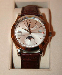 1) JLC Master Calendar. Нравятся тем, что это ЧАСЫ. То есть autotractor и прочее. Лаконично, технологично и конечно богато огромной историей. Кроме того, я предчувствую, что у нас в стране популярность марки будет расти (как сейчас Улиссы к примеру) - результат их политики по "примоднению" в Европе. Немного не нравятся своей излишней примитивностью, какой-то "нестильной простотой". Хотя возможно календарь-то ей и не отличается (просто глаз замылился) - я начинал с Master Hometime, и вот там-то эта примитивность просто кричащая. Опять-таки - это просто вопрос моего вкуса, часы отличные, и на многих выглядят как надо. Просто для меня, например, стандартное костюмное одеяние менеджера дорогого автосалона так же уныло.
