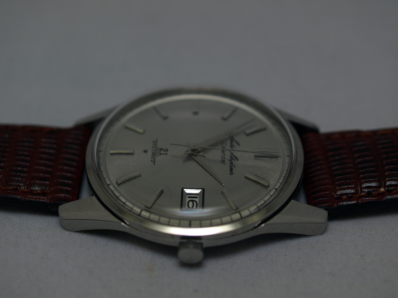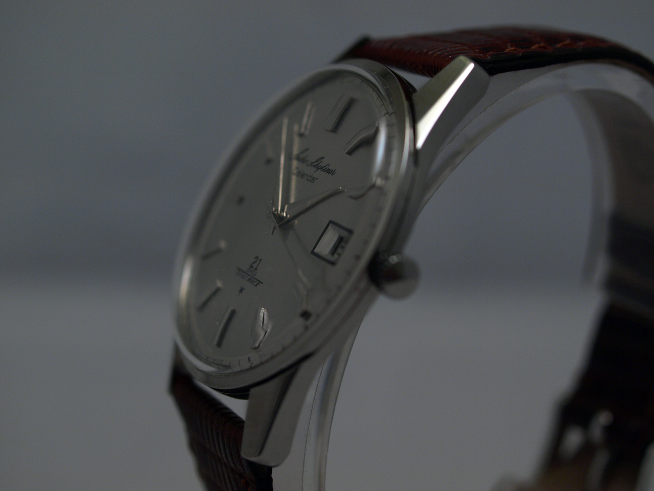 На фото эти редкие часы в практически идеальном состоянии (репассаж в мастерской Чайкина, восстановленный циферблат, идеальное состояние стекла и диска дат, кожаный ремешок, полностью аналогичный по внешнему виду оригиналу 1964-го года, задняя крышка с мелкими царапинами (не полировалась во избежание удаления оригинальной маркировки) и полной надписью, точность хода +- 20 сек/день).