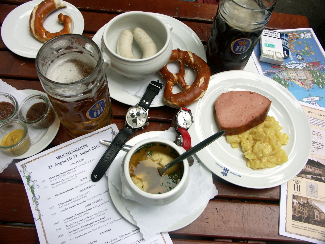 Минуту спустя за соседний столик пришла дюжина немцев, и герр Тимофеев притащил им 12 бокалов пива. По литру. По шесть емкостей в каждой руке. Я, чесслово, охренел, о чем вежливо сказал герру Тимофееву. И пожалел, что не успел сфоткать. Герр Тимофеев сказал в ответ, что 12 кружек – фигня. Его личный рекорд – 17 литровых кружек за раз. Если закажу 17 порций пивка - увижу. Сто евро – дорого за снимок, так что я был вынужден поверить герру Тимофееву на слово, а вы – мне. После Хофбрау очень сильно соскучиваешься по слову «проголодался», а на сосиски и стилизованные под них предметы не можешь смотреть минимум неделю. Вот и я чахну над последней тарелкой с лэдервюрстом, посыпанной тертым кэзе.