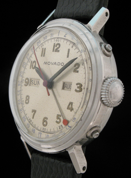 Dial: Original factory printed dial in near mint condition. Date indicated around the outside edge, apertures at 9:00 and 3:00 to show day and month. Luminous numbers and hands. Signed Movado, Switzerland.