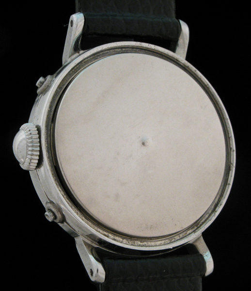 Case: Solid stainless steel case with waterproof screw on back, pushers and crown. Signed inside the back Movado Factories Switzerland, Fabrication Suisse, FB (François Borgel) Patent and Stainless Steel Inal. Measures 33mm in diameter. 16mm strap.
