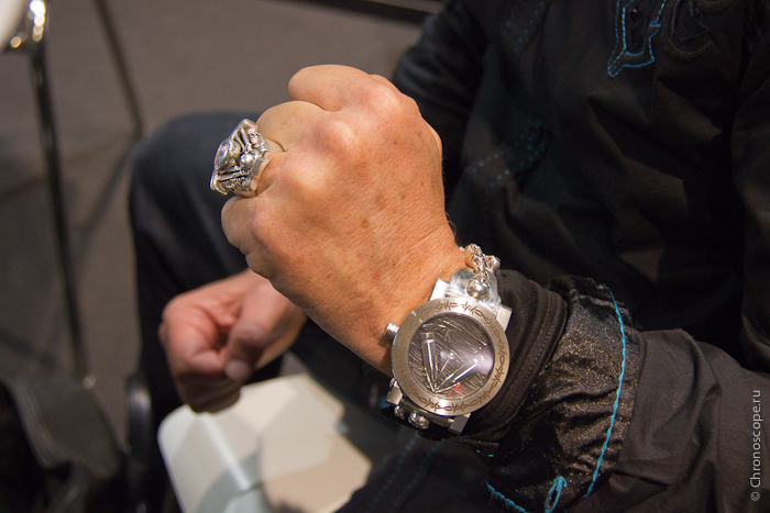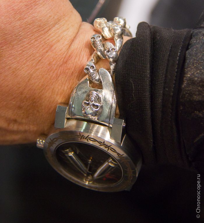 Безусловно (смеется)! Это часы для Хэллоуина: стрелки в виде ножей, на циферблате настоящая кровь, две половинки серебряной пули, отлитой во время полнолуния. Все гравировки выполнены Кизом Энгельбартcом, он мой большой друг, он тоже работал над ними в полнолуние. Часы натерты чесноком. Можно сказать, что перед вами современное средство против вампиров. Против тех, кто пьет наши соки сегодня – против всех этих банкиров, адвокатов и прочих кровососов.