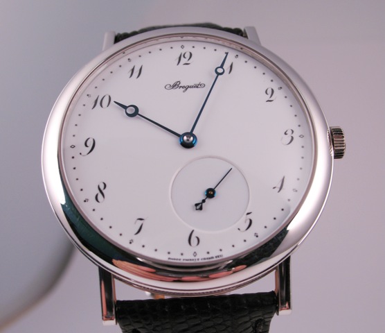 Классика, под костюм, белое золото, черный кожаный ремешок, светлый циферблат, без усложнений и "изысков" до 25000$
