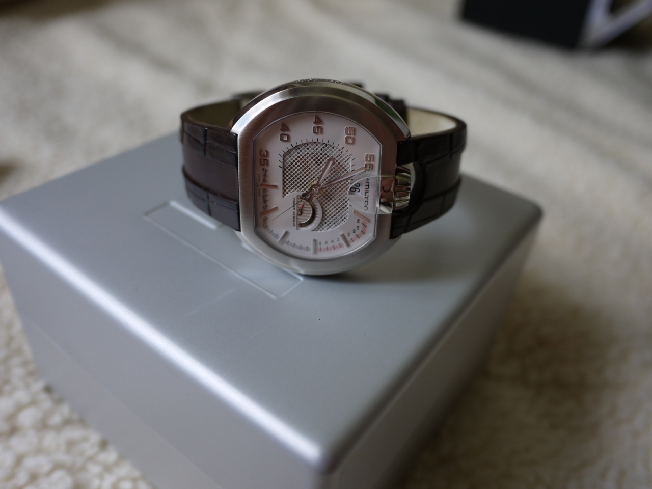 при взгляде на их белый циферблат сразу обращаешь внимание на минутную разметку от 35 до 55, которая имитирует спидометр машины. А еще на необычную шкалу, которая тянется от отметки 1 до 7. Это стилизация под указатель оборотов двигателя автомобиля. Агрессивный образ часов поддерживают «радиаторная решетка» в центре циферблата.