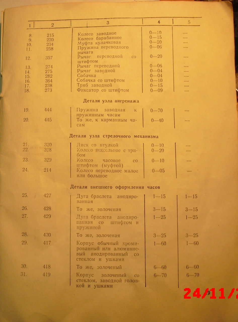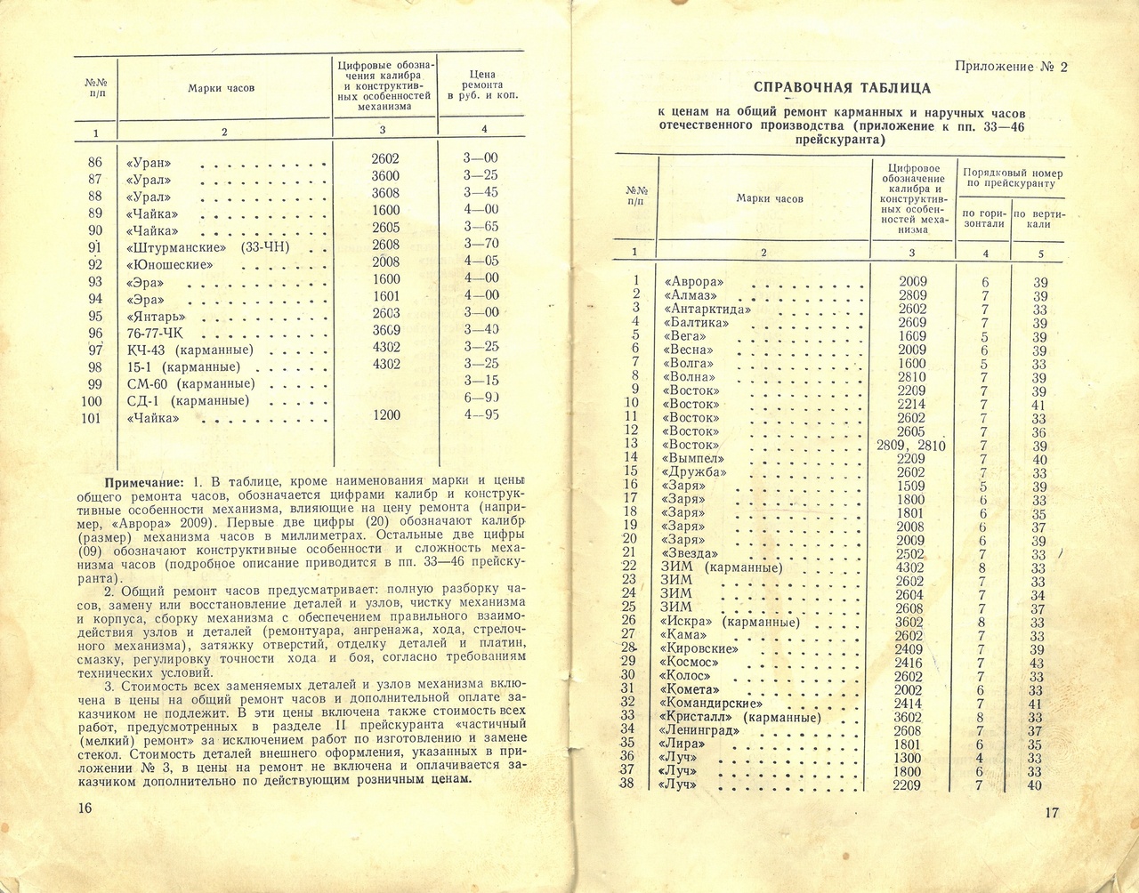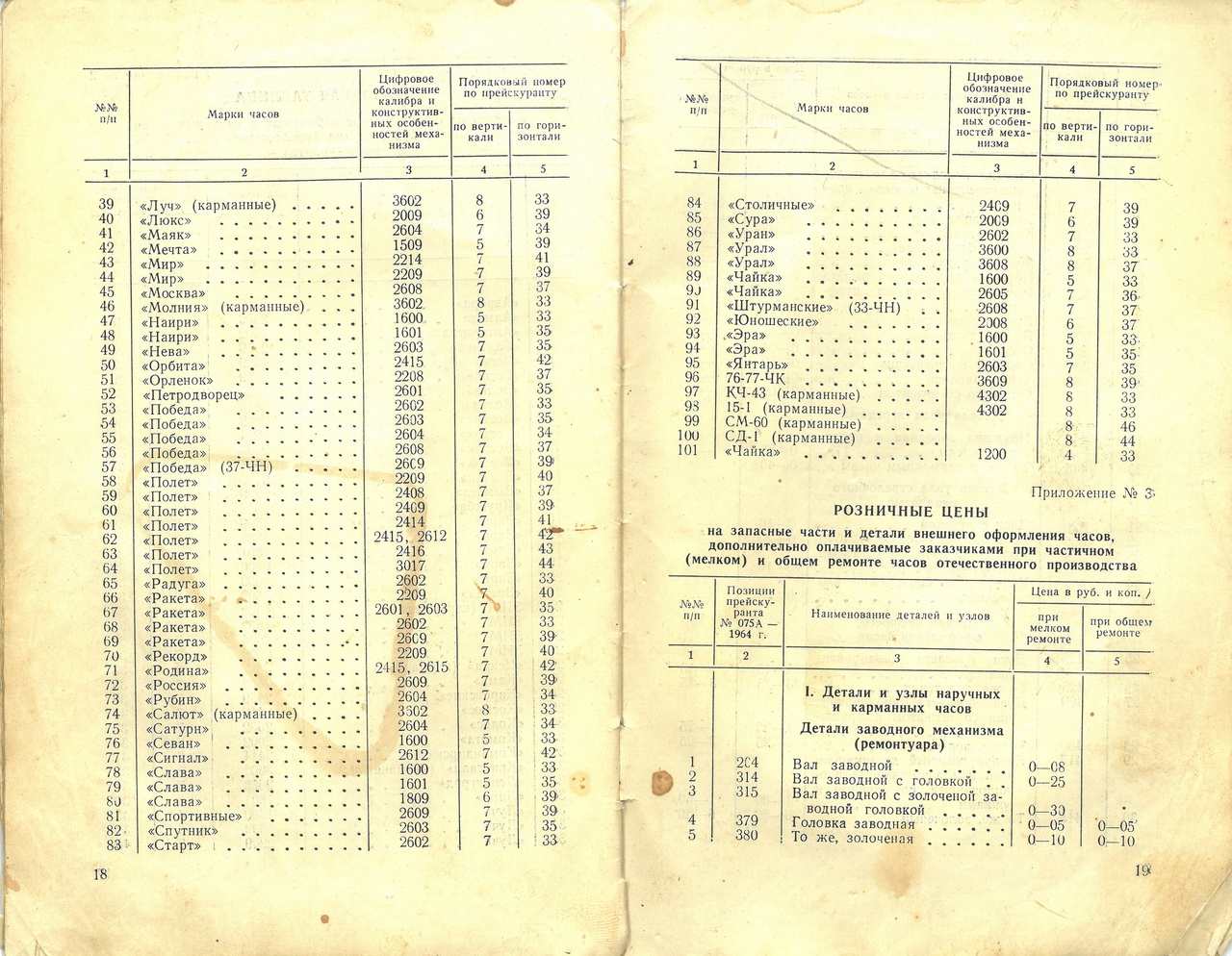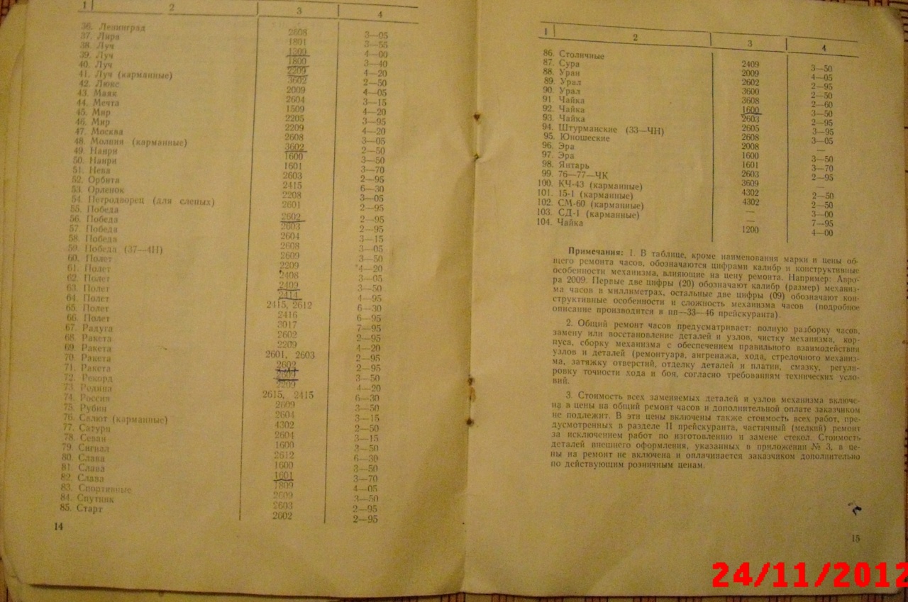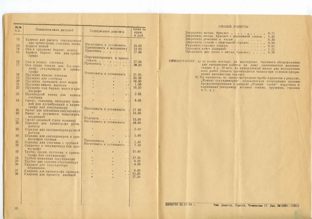 Прейс-курант отпускных цен на ремонт часов, 1954