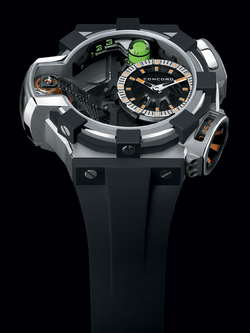 Внушительная заводная головка полностью спрятана и появляется из своего укрытия при нажатии на соответствующую кнопку. Люминесцентные оранжевые секундные метки находятся не на циферблате, а на боковой стороне корпуса. Выгравированные на черном алюминиевом валике, они видны через окошко, оформленное в том же стиле, что и заводная головка. Сквозь боковое сапфировое стекло можно рассмотреть и вращающиеся зубцы колеса секундной стрелки.