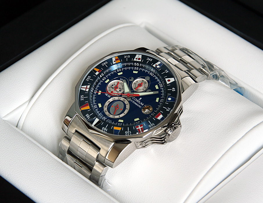 Настоящий Адмиральский Кубок с цветными флажками, очень яркие, позитивные, привлекающие внимание часы. Таких уже не выпускают. Современная линейка Corum выглядит довольно уныло и обыденно. Отлично сядут на стандартное запястье 18-19 см, но не потеряются и на более крупном. Диаметр этих часов -