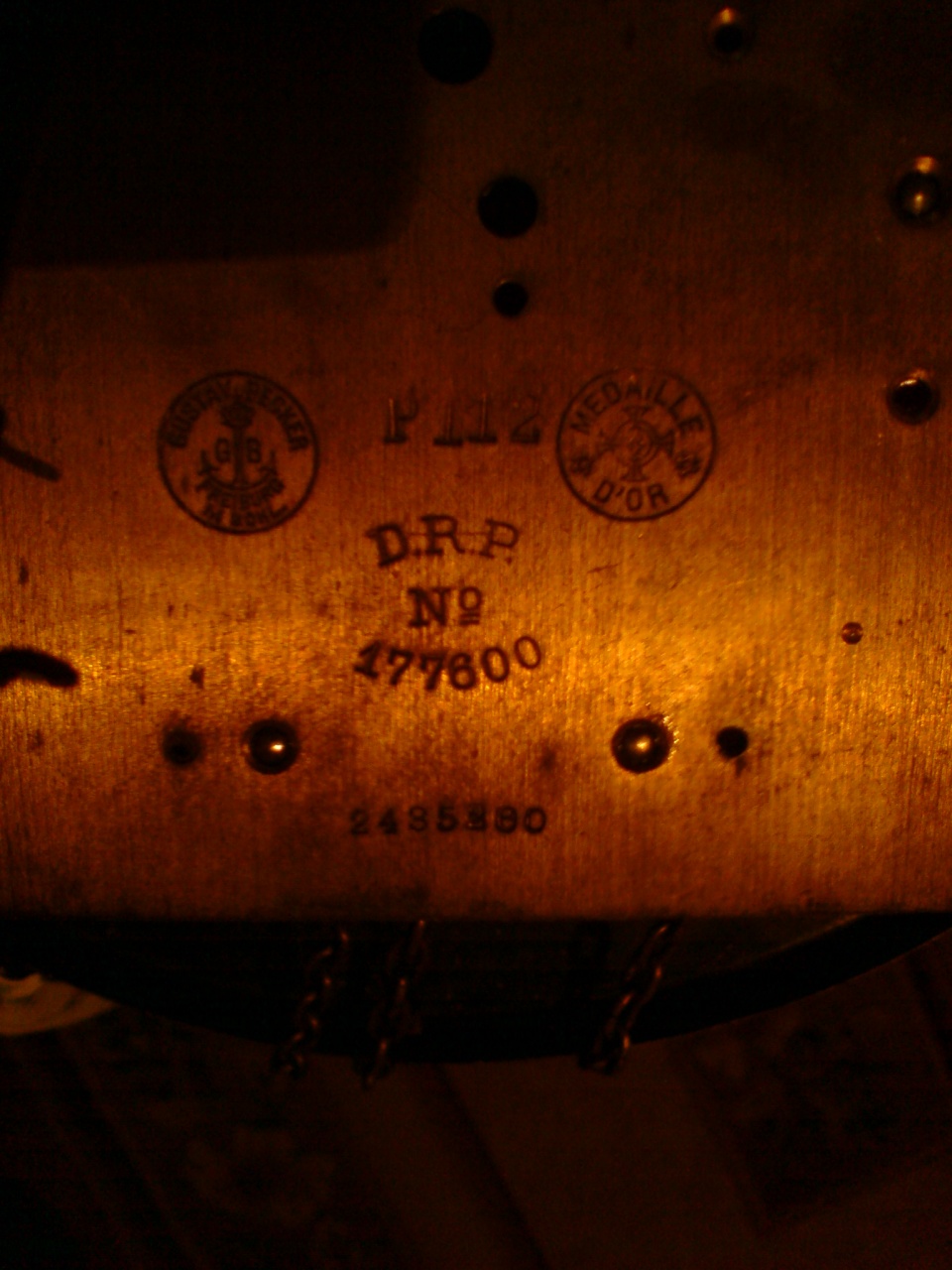 Номер на часах 2435200 (первый ноль выбит с поперечиной, исправлено на 8, но и под циферблатом этот номер ноликом без поперечины). Два клейма круглых стандартных, посередине Р112 (длина маятника), D.R.P. №177600.