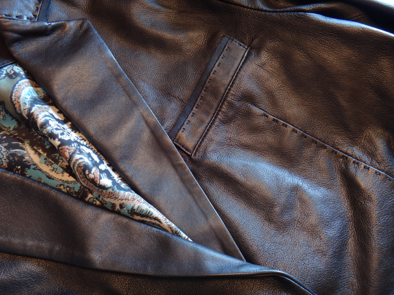 Швы крупной строчкой, отделка карманов и лацканов замшей: