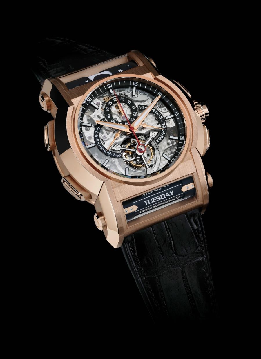 Модель оснащена швейцарским механизмом с ручным заводом Maîtres du Temps MDT SHC 02.1, на 58 камнях, с балансовой частотой 21600 полуколебаний в час (3 гц) и запасом хода 60 часов. Набор функций калибра впечатляет: индикация часов, минут (посредством соответствующих центральных стрелок), даты (посредством соответствующего аналогового ретроградного указателя, расположенного на 3 часах), времени GMT (посредством соответствующего аналогового ретроградного указателя, расположенного на 9 часах), дня недели (посредством соответствующего указателя в виде вращающегося ролика с нанесенными на него наименованиями дней, расположенного в нижней части корпуса), фаз Луны (посредством соответствующего указателя в виде вращающегося ролика с нанесенными на него изображениями Луны, расположенного в верхней части корпуса), а также с хронографом (центральная секундная стрелка красного цвета и 60-минутный счетчик хронографа, расположенный на 12 часах) и турбийоном, каретка которого расположена в круглой апертуре на 6 часах). Калибр отлично отделан и декорирован.