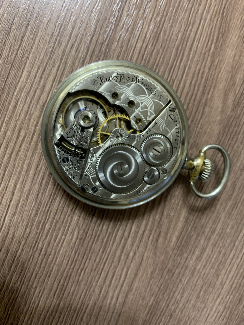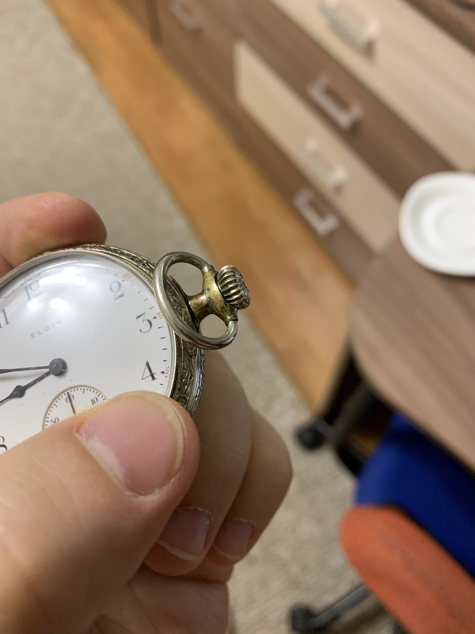 Карманные часы Elgin, 1906 год. Планировал сделать репассаж у профессионалов и самому переставить в корпус для наручных. Для замера механизма и корпуса стал разбирать, оказалось, что заводной вал к механизму не крепится, а вставляется в квадратный паз. Заводной вал при этом фиксируется в корпусе.