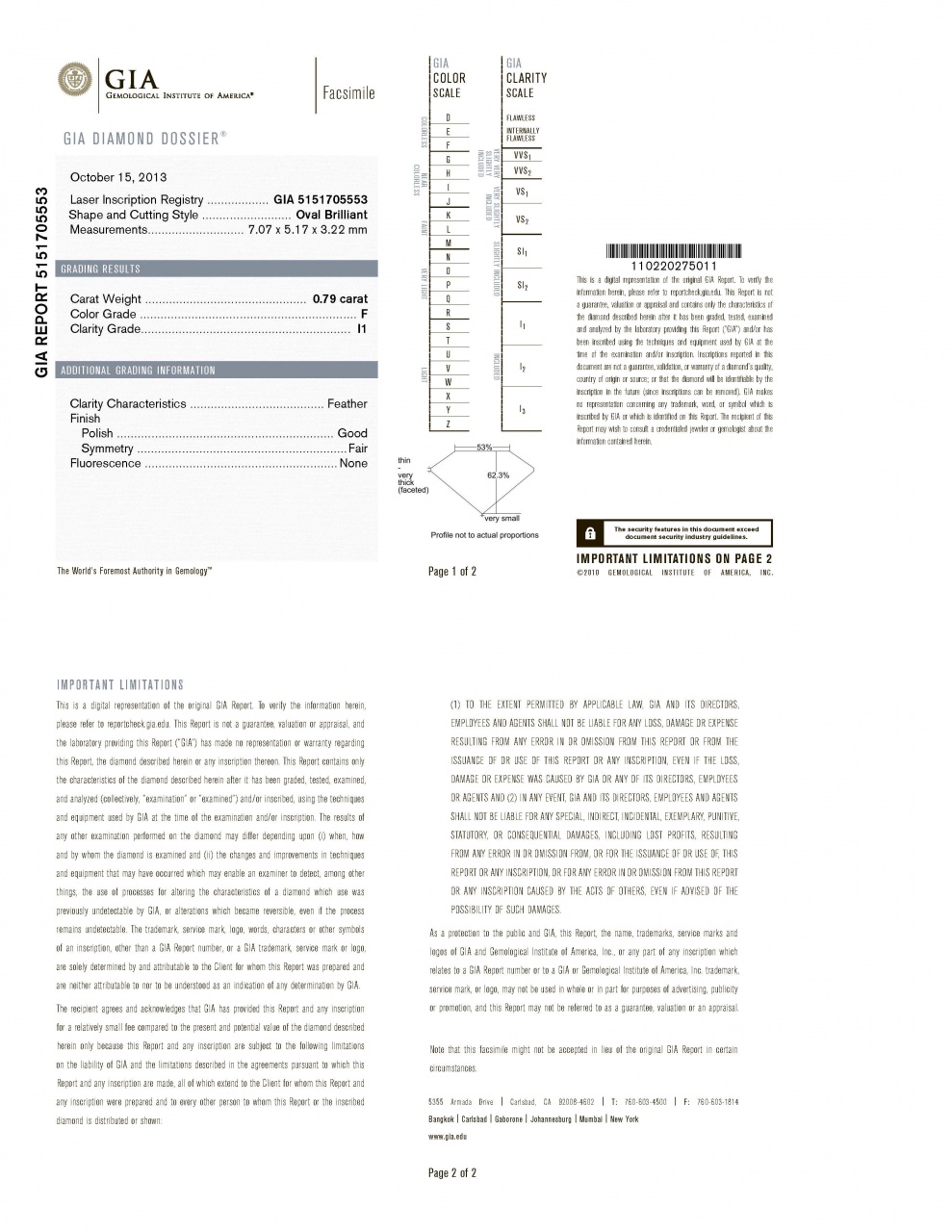 Бриллиант огранки "Овал", вес 0,79 карат, цвет F (3), чистота I1 (8). Сертификат GIA #5151705553 от 15.10.2013