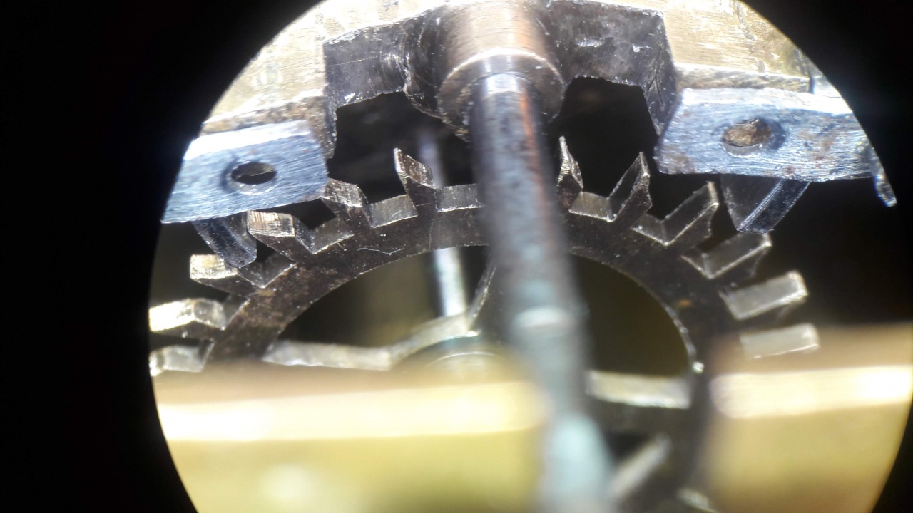 Из-за неумелых действий мастера, который полез регулировать ход Грахама, не понимая, как он должен работать. При очень малой глубине хода либо зубцы стачиваются об острую палету либо анкерное колесо прокручиватся и загибаются тонкие вершины зубцов - достаточно попытки регулировать нажимая пальцем на 2-е от анкерного колесо.