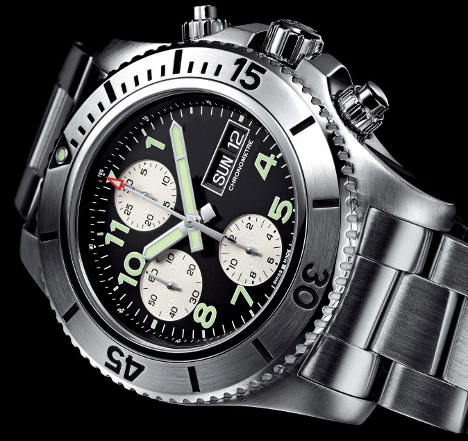 Корпус круглый, изготовленный из нержавеющей стали, диаметром 44,0 мм, водонепроницаемый до 500 метров. Защищенная заводная головка и пушеры хронографа (расположенные на 3, 2 и 4 часах) завинчивающиеся. Вращающийся однонаправленный дайверский безель. Сапфировое стекло защищает циферблат с арабскими цифрами, часовой, минутной и центральной секундной стрелками, покрытыми люминесцентным составом светло-зеленого цвета.