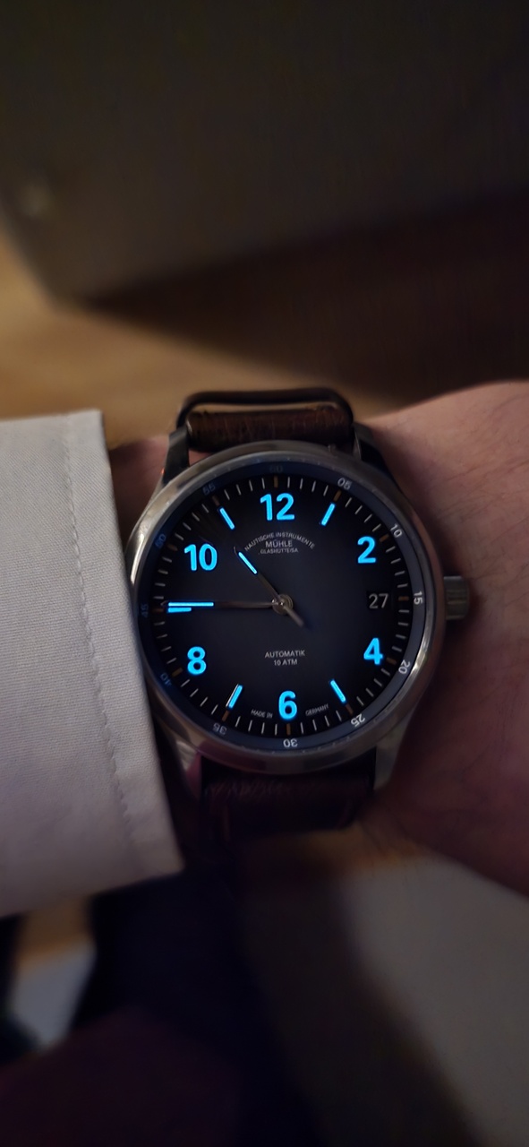 В общем, часами я доволен, для работы подходящий вариант. На них приятно лишний раз просто так посмотреть, не ради времени, а ради удовольствия. На руке сидят удобно, не высокие, под рубашку вполне помещаются. Радует, что из Glashütte – часовой «столицы» Германии. Понравилось многое именно из Mühle, но они оказались ещё более великоваты для моей худой руки.