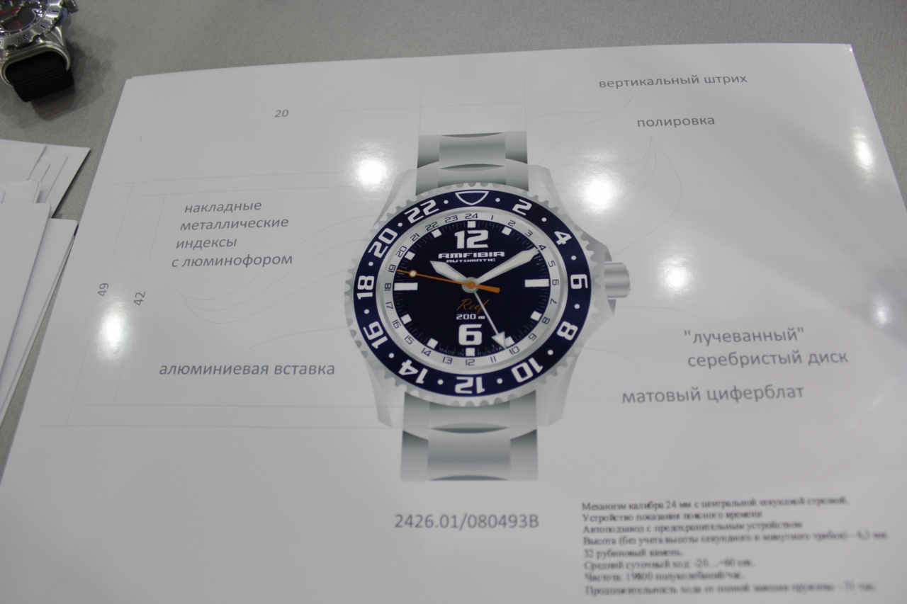 дизайны новых амфибий и сотрудники завода рассказывали о новинках и отвечали на все вопросы. Всем посетителям выдавали фирменный пакет с набором информационных материалов о выпускаемых заводом моделях часов и механизмов.Справа на вращающихся витринах расположились коллекции турбин и текущих амфибий. Посетителей, не смотря на последний день выставки было много, пустым павильон не удалось сфотографировать. Среди посетителей было замечено много молодежи, которая интересуется продукцией завода. Я приехал на выставку с желтым рифом, когда стоял и общался с сотрудниками завода к нам подошел молодой парень с таким же рифом на руке ))