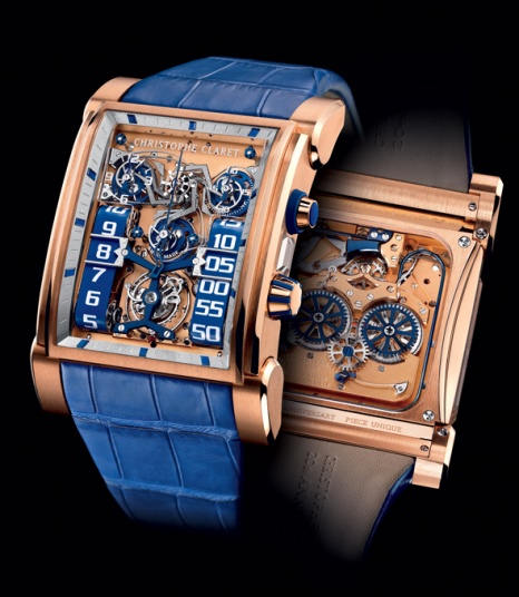 Как и было обещано, Кристоф Кларе представил свои дебютные часы и это действительно нечто особенное, даже можно сказать, что такого еще не было среди произведений часового искусства! Во-первых, это часы с ленточным указателем часов и минут (лента сделана из каучука с переведенными цифрами), что уже является новым «словом» в Haute Horlogerie. Затем, механизм хронографа, с планетарной системой управления, операции «Старт/Стоп» и «Сброс» осуществляются одной кнопкой и сопровождаются звуковыми сигналами. И, конечно, не обошлось без турбийона (совершающего один оборот в минуту), в производстве которых фабрика Christophe Claret непревзойденный лидер. Индикатор запаса хода даже кажется тут лишним.