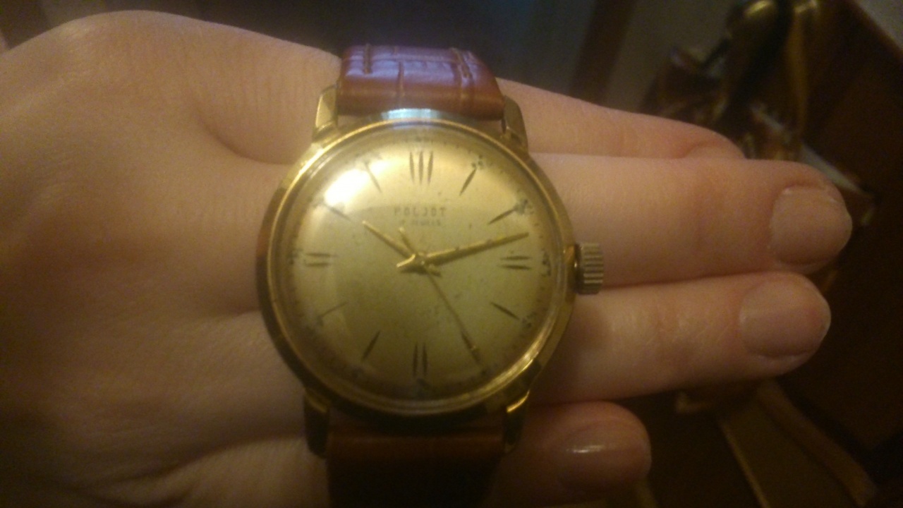 Костюмный Полет, Производство Советский Союз, куплены примерно в 1970-1975 годах моим отцом, то есть у часов все время был один владелец. Последние лет 15-20 лежали в шкатулке дома с треснутым стеклом и не работающим заводом. Механизм советский - механический, полет, 17 камней. Золотистый циферблат, позолоченный корпус, позолоченные стрелки и метки, центральная секундная стрелка. Ручной завод. Корпус 34 мм в диаметре. Часы полностью исправны, восстановлены мною, только что прошли репассаж в Тайм сервисе- официальным сервисе швейцарских часов в Москве. Дана гарантия на работу 6 месяцев. Часы отремонтированы, смазаны, почищены. Поставлено выпуклое новое стекло. Видимых повреждений на корпусе нет. Отличный точный ход в пределах 10-15 сек. в плюс в сутки, что для наших часов является очень хорошим показателем.. Поставлен новый ремешок красивого коньячного цвета из натуральной кожи. На руке сидят и смотрятся просто великолепно, надевал с костюмом пару раз в офис.Подойдут как на мужскую, так и на женскую руку.