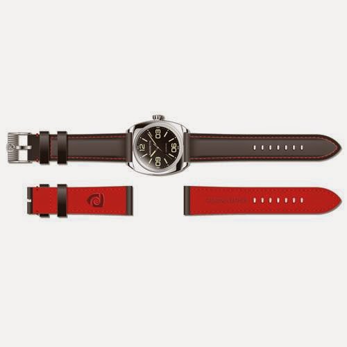 Leoncino будет поставляться с двумя ремнями: стандартным 22 мм. черным кожаным ремешком с красной строчкой и дополнительным так же 22 мм. коричневым ремешком. Обратите внимание на необычную баклю с логотипом MAGRETTE. Она очень хороша.