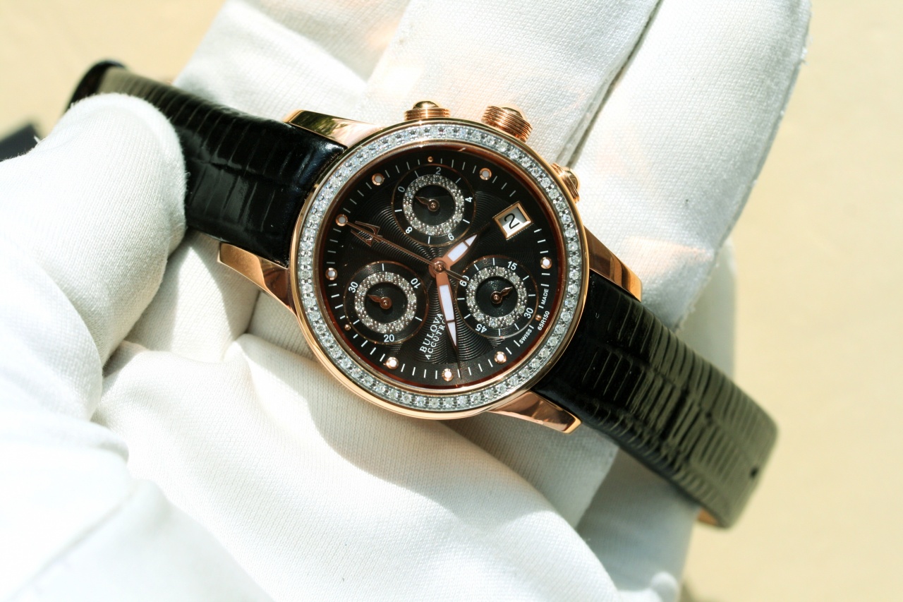 < < < [женский хронограф] BULOVA MASELLA ** 90 бриллиантов ** позолота ** черная кожа > > >