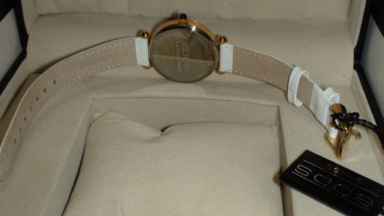 Элегантные женские часы швейцарской фирмы Epos на белом кожаном ремешке.