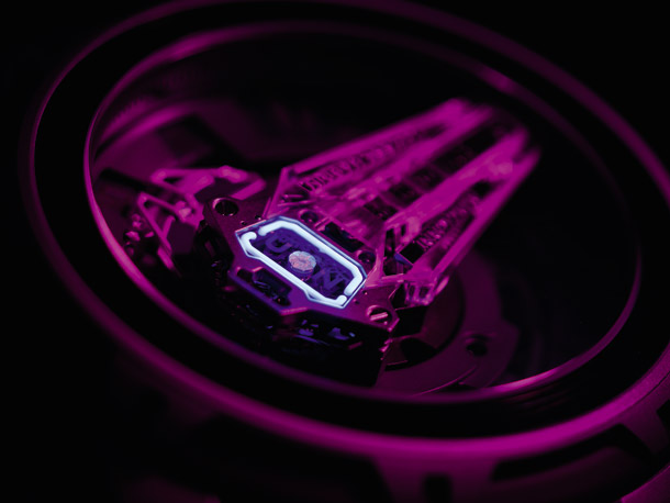 Тем не менее, Ulysse Nardin использует его для производства относительно небольших деталей впервые. Герметичность сцепления достигается благодаря сжатию гидрофобных поверхностей при температуре от 1800 до 2200 градусов по Фаренгейту (от 1000С до 1200С) с добавлением кислорода. Новым для процесса является тот факт, что он создает стабильное соединение оксида кремния, который замет используется во всей структуре. И в данном контексте, две структуры становятся единым целым. (Один патент заявлен).