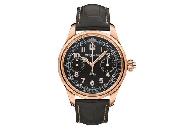 Круглый полированный корпус новинки, изготовленный из 18-каратного розового золота, диаметром 44,00 мм, толщиной 13,15 мм, водонепроницаемый до 30 метров. На торце рифленой луковицеобразной заводной головки имеется хронографический пушер; в свою очередь, на торце последнего имеется шестиконечная звезда - эмблема бренда Montblanc. Сапфировое стекло установлено на передней стороне часового корпуса и на его задней крышке. Циферблат матово-черный, с напечатанными арабскими цифрами, покрытыми, как и золотые часовая и минутная стрелки, люминесцентным составом бежевого цвета. Историческая эмблема Montblanc, выполненная в белом цвете, размещена на 12 часах. На периферии циферблата расположена круглая тахиметрическая шкала.